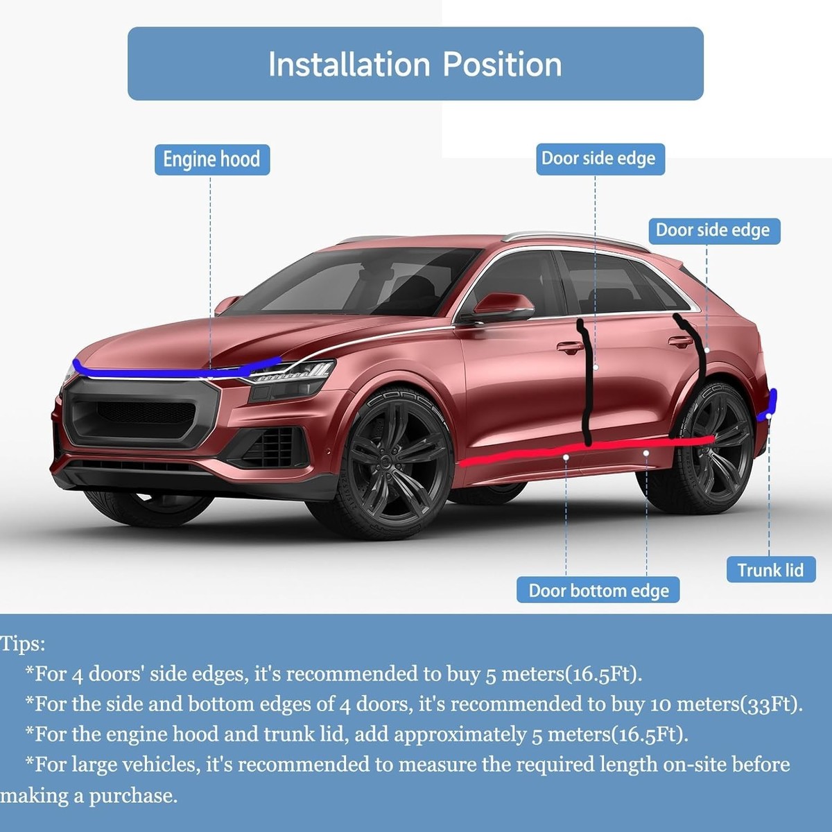 5 meters and 10 meters are available options. The 5-meter length is suitable for the upper half of 4 car doors or 2 car doors, while the 10-meter length is suitable for all 4 car doors. For larger vehicles, it is recommended to measure with a tape measure before making a purchas