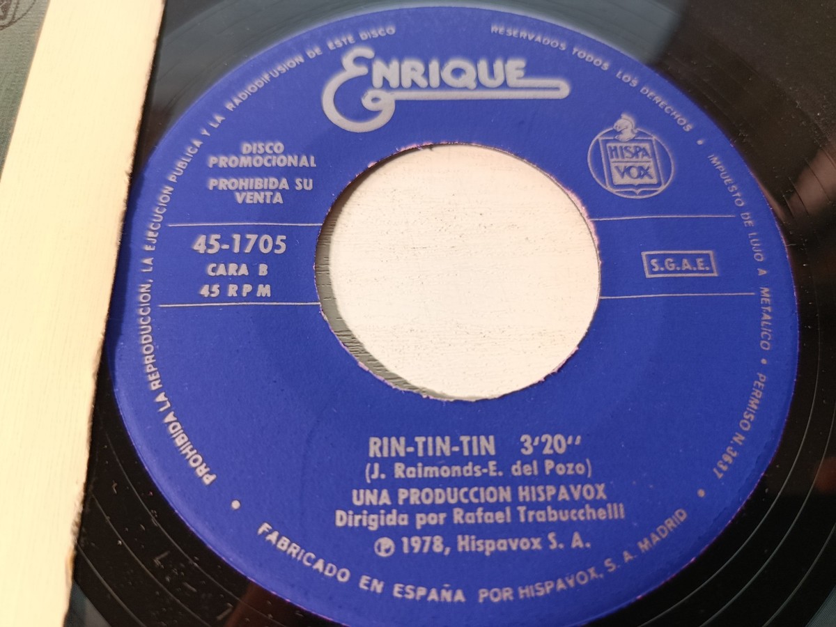 Original promotional edition published by Hispavox in 1978 con de number 45-1705. Contains los themes Very good Thomas (Jose Luis perales ) and Rin-Tin-Tin (J. Raimonds - E. del Pozo). Hispavox production directed by Rafael Trabucchelli. vinyl pressed in Spain con blue Hispavox labels and the inscription ?Promotional Record ? Sale Prohibited?. Original cover con photograph de Enriquedel Well in suitblanco and full textde the song on the back cover.