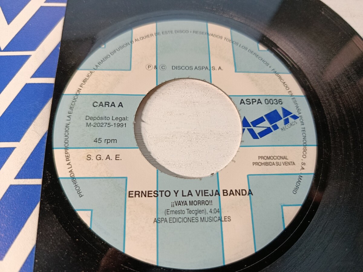 Ernesto y La Vieja Banda, Vaya Morro, ASPA Records, 1991, ASPA 0036, Ernesto Tecglen, Spanish pop, musical humor, promotion, promotional single, 7-inch vinyl , 90s, rarity, collecting, vintage, Tecnodisco Madrid, ASPA Ediciones Musicales, made in Spain
