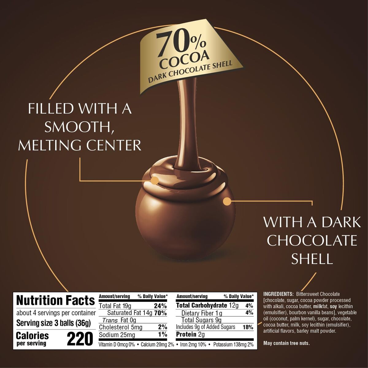 With a delicate, 70% cocoa chocolate shell and an impeccably smooth melting center, these extra dark chocolate truffles deliver a full-bodied, masterfully balanced taste made for aficionados. When you break the shell, the truffle's smooth, luscious center begins to melt and so will you.