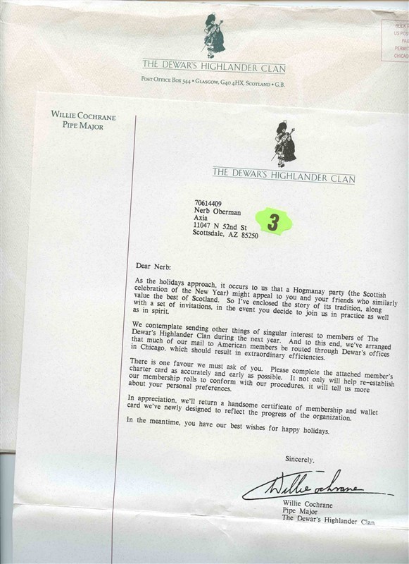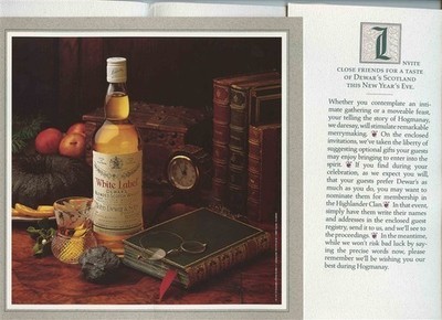 A large 9 1/2" x 9 1/2" envelope with cover letter. Also in the envelope is a Hogmanay Folder . Hogmanay is The Traditional Scottish Celebration of the New Year. In the folder are 6 unused Invitations and 6 unused Envelopes , these were from the 1989- 1990 New Year. Plus Information on Hogmanay, Dewar's Highlander Clan Member Charter 4 page application and 4 page Guest Registry. all in very fine con dition.