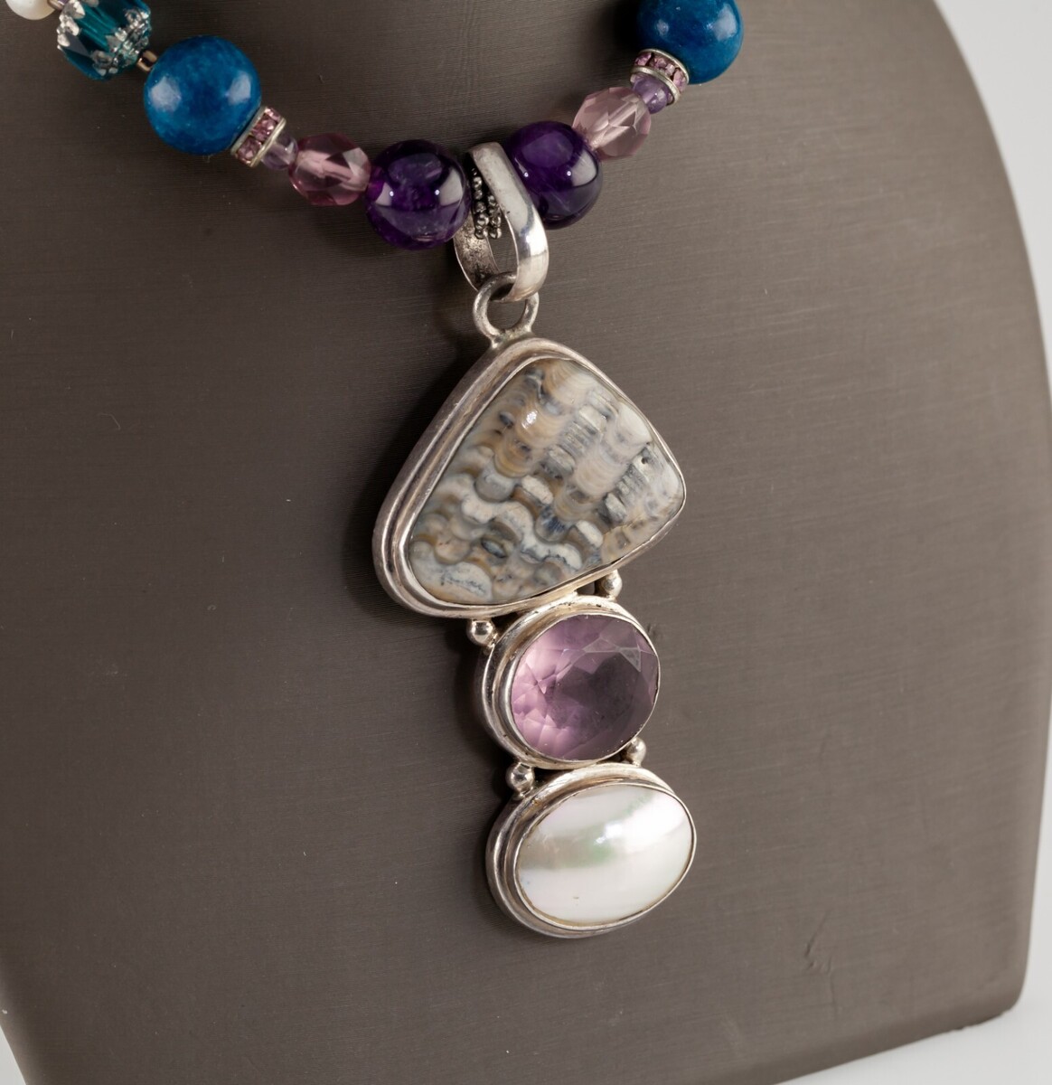 Pendant Features Bezel-Set Mother of Pearl, Amethyst, and Fossilized Claim Shell in Succession
