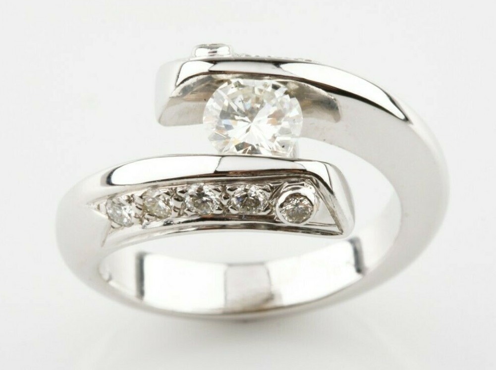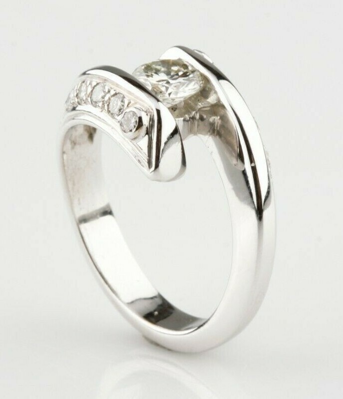 The featured diamond is set within a diamond set bypass design, completed by a three and one-hald millimeter wide band. Identified with markings of "18K." One channel set round brilliant cut diamond, measuring 5.70 - 5.70 x 3.50 mm (depth est.) approximate weight of 0.70 ct. Graded in the setting. Ten bead bezel set round brilliant cut diamonds, measuring 2.20 - 2.00 x 1.26 mm (depth est.) approximate total weight of 10 stones = 0.35 ct. Graded in the setting. Your continuing satisfaction is very important to us. We offer a 30 day money back return policy. If you are unhappy with your purchase for any reason, please notify us so that we can begin the returns process. All items for sale are available for viewing at our Southern California showroom. We would like to thank all of our loyal