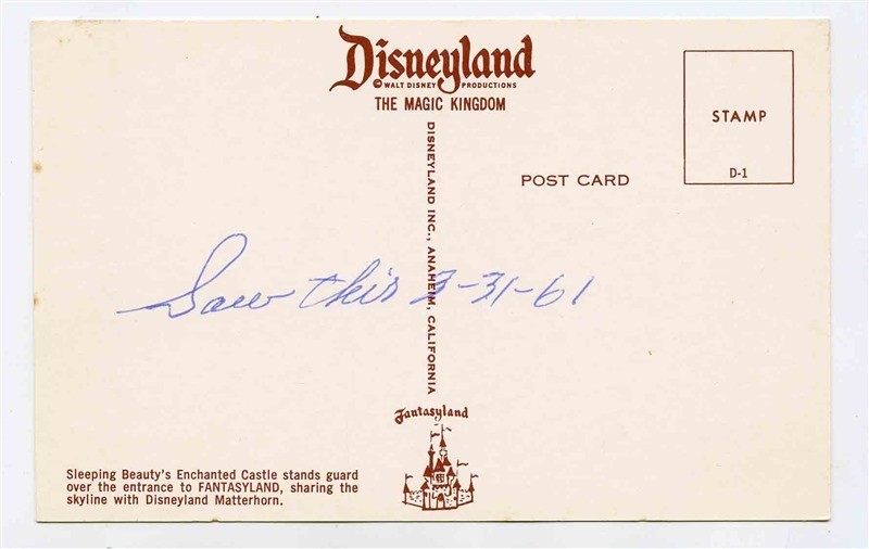 An unused Disneyland postcard. This is Sleeping Beauty Enchanted Castle , with D 1 in the stamp box. In Fantasyland. Has date 3-31-61 written on the back