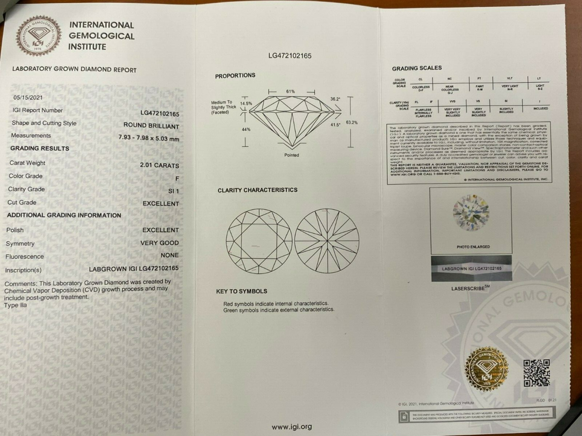 o This Laboratory Grown Diamond was created by Chemical Vapor Deposition(CVD) growth process and may include post-growth treatment. Type IIa