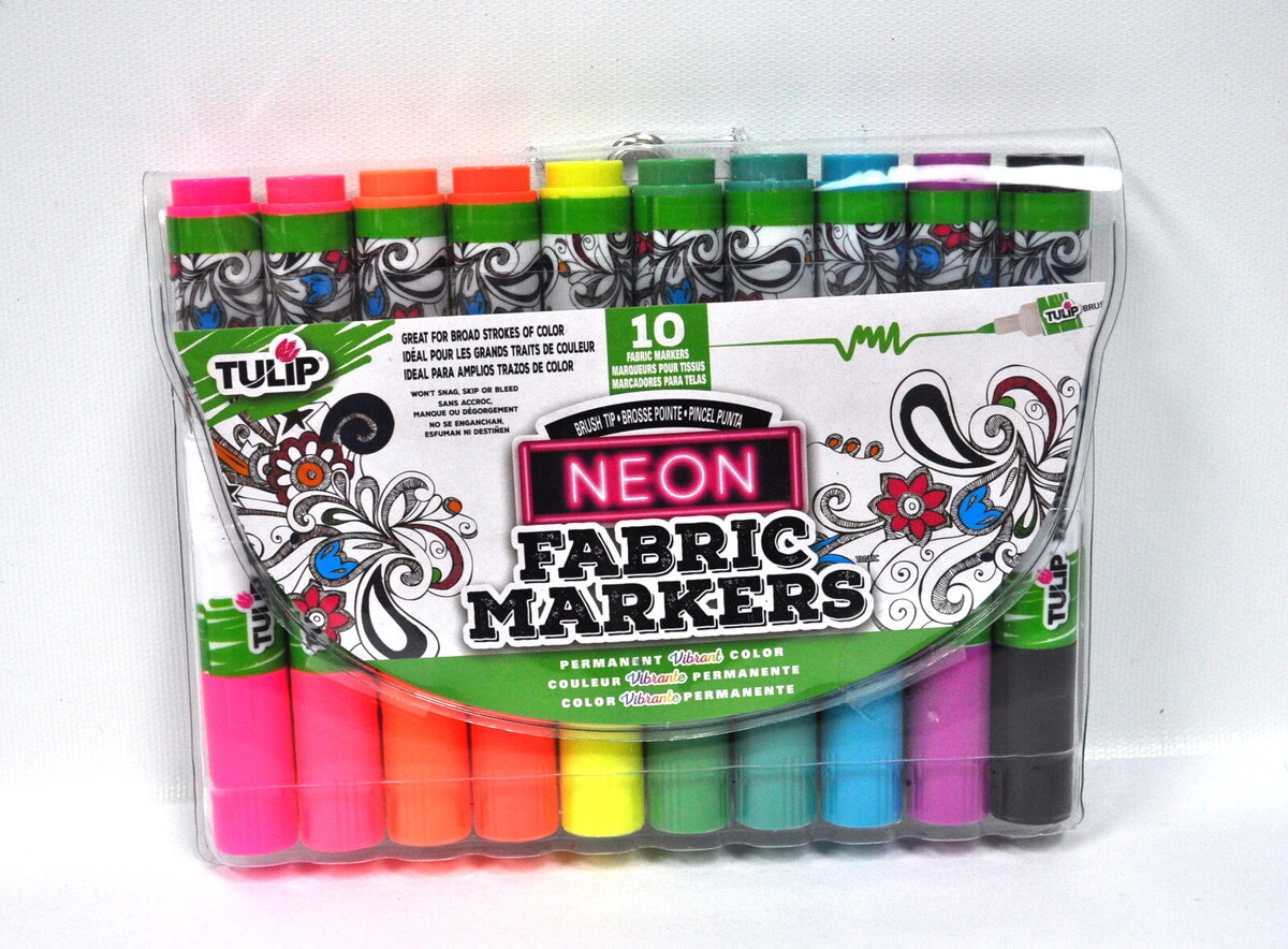 Tulip Brush Tip Neon Fabric Markers 10 Pack. Draw, doodle and color your way to ultra vibrant works of art with Tulip Fabric Markers. Packed with rich, intense pigments, you can always count on these Fabric Markers for true color that lasts. Easy to use for all ages, Tulip Brush Tip Fabric Markers are available in a reusable storage pouch for easy access. Tulip Brush Tips are perfect for doodling, stenciling and creating bold accents on fabrics. All inks are nontoxic and machine washable, and do not require heat setting for permanence. Markers work on most fabrics. 10 Brush Tip Fabric Markers in Package. CHK-31649