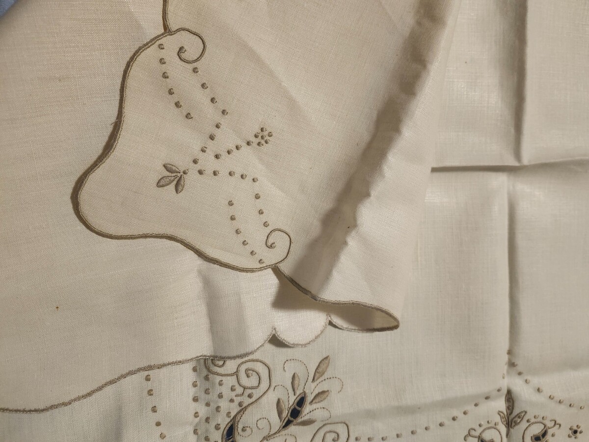 This vintage Madeira embroidered cutwork tablecloth is a stunning piece that exudes elegance and charm. Measuring 39" square, this beige cloth tablecloth features intricate embroidery and cutwork details, adding a touch of sophistication to any table setting. Handmade in Portugal in the 1950s, this original piece is perfect for all occasions and should be carefully hand washed to preserve its beauty. A true collectible item, this tablecloth is a timeless treasure that will enhance the look of any dining room.