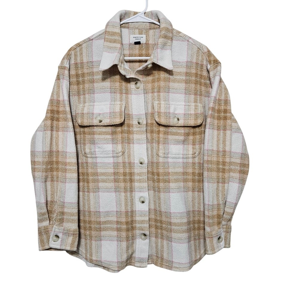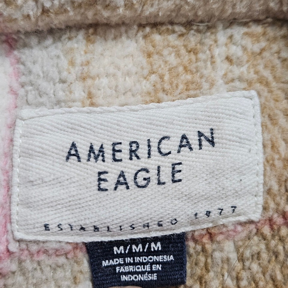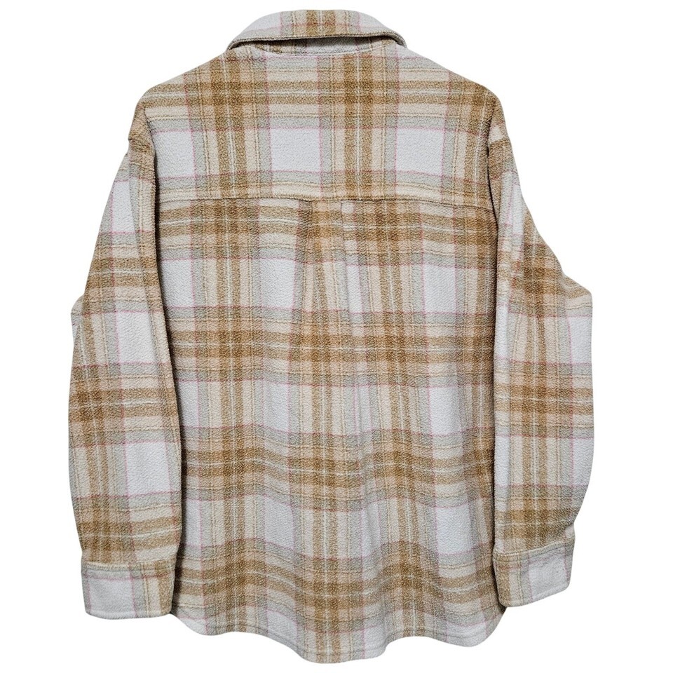 American Eagle Oversized Plaid Fleece Love Shacket Tan Pink Cream Med cozy women