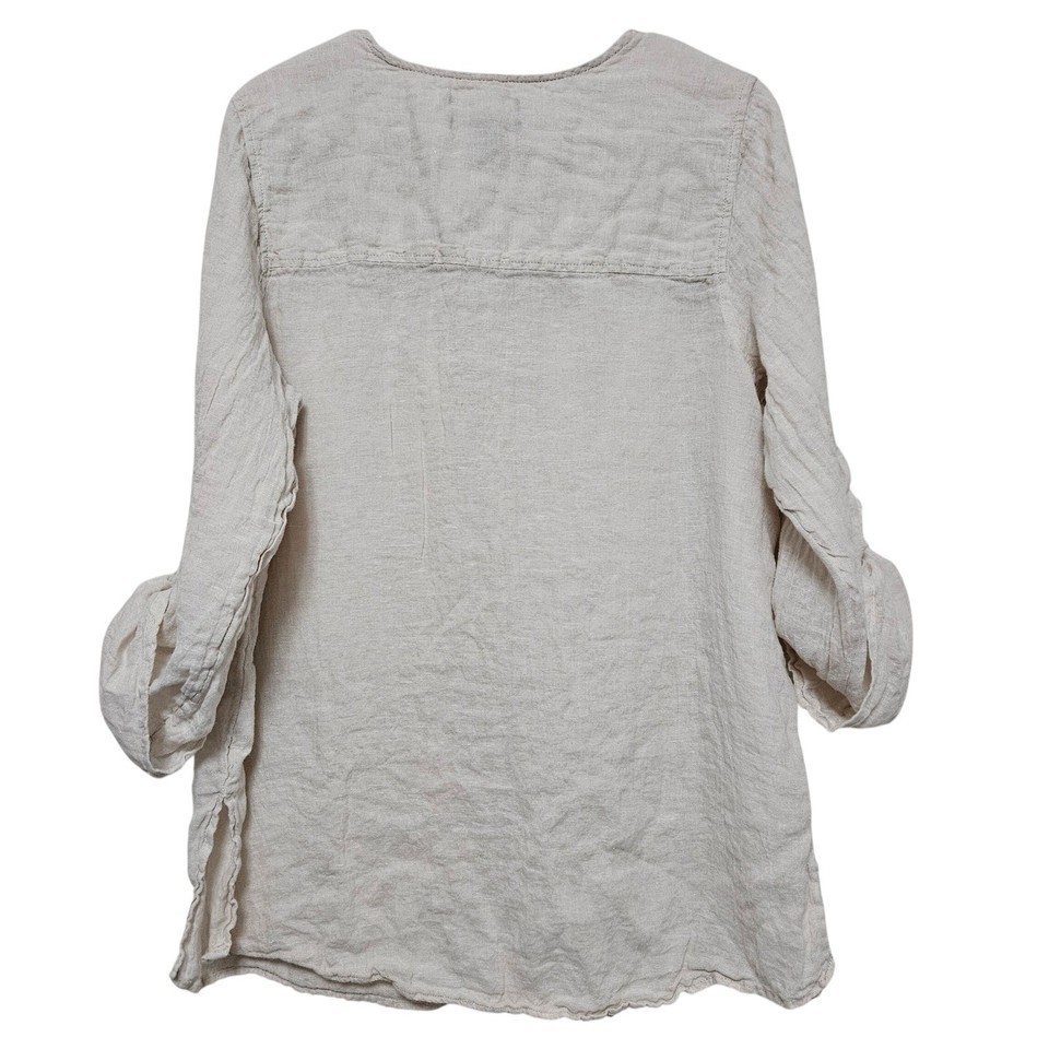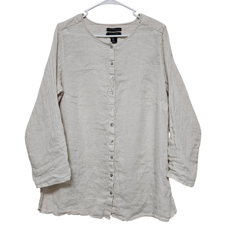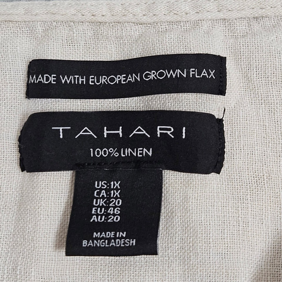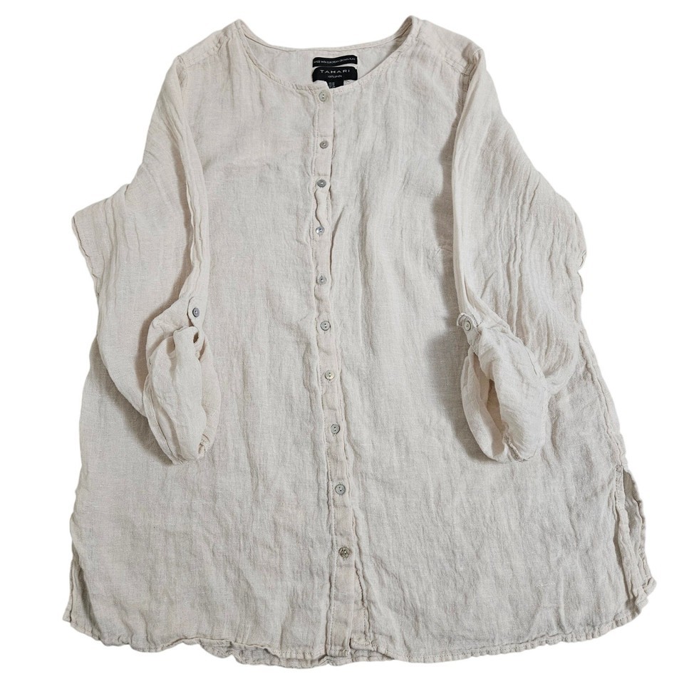 Tahari 100% Linen Oversized Button Up Tunic 1X Beige Lagenlook Coastal Chic Plus