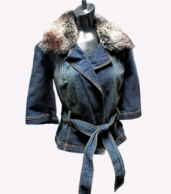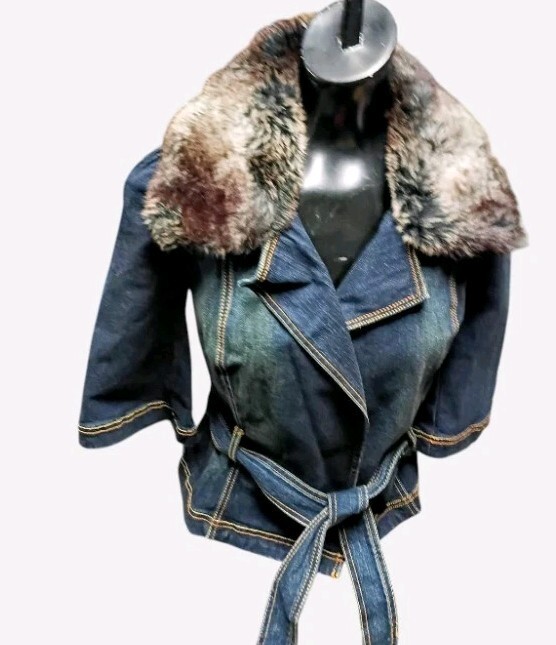 Denim Y2K Jacket With Tie Waist And Fur Collar Trim By Fabulosity Size Medium