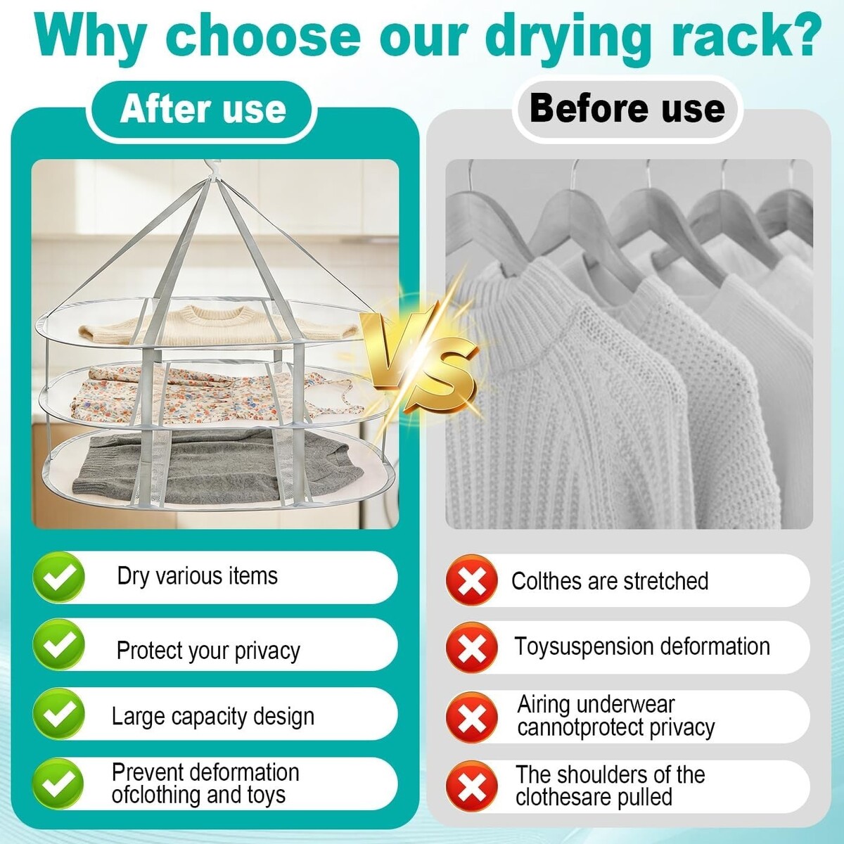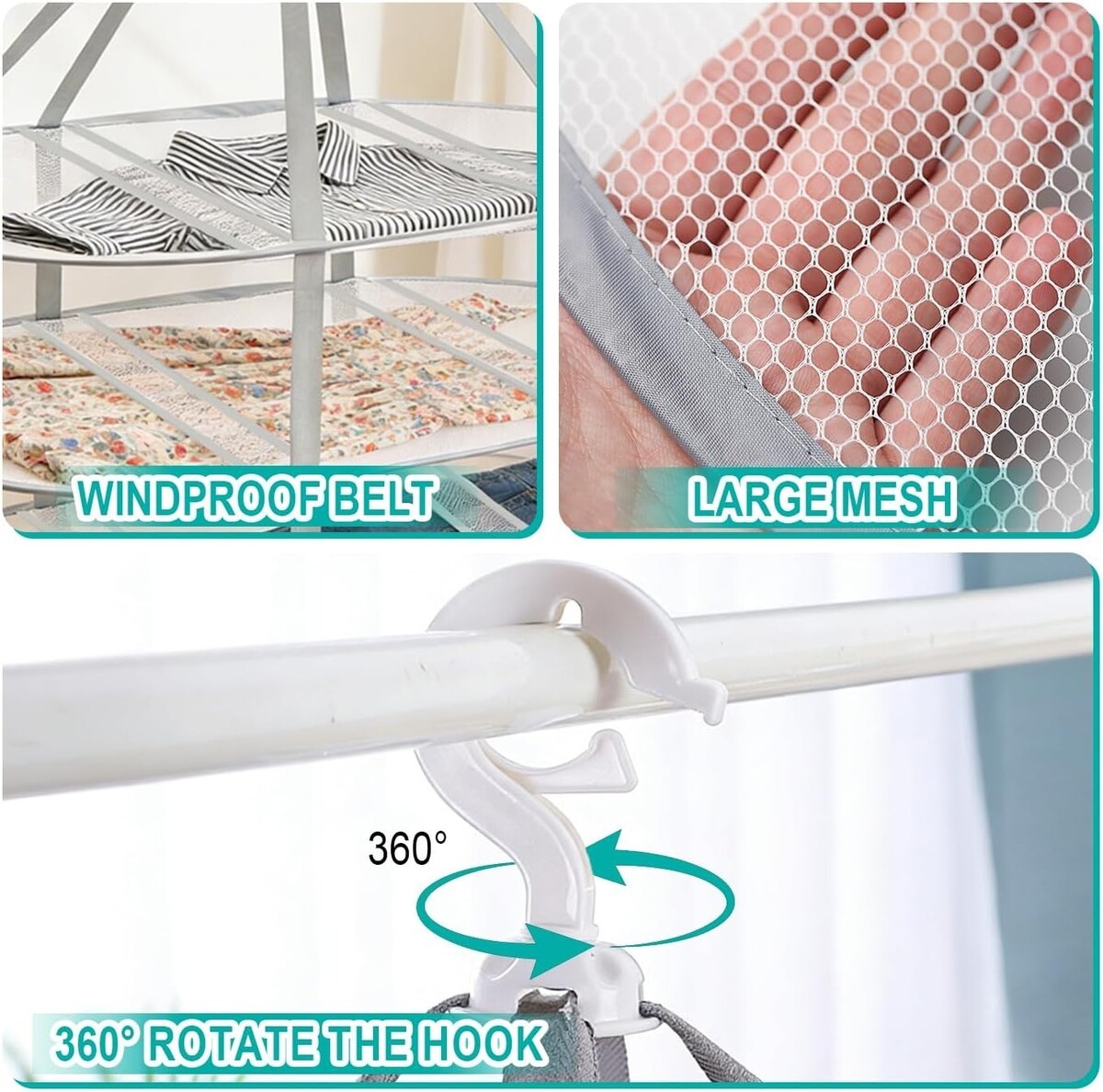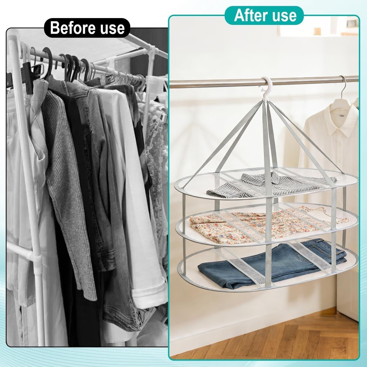 3-Tier High-Capacity Drying: A triple-layer mesh design significantly increases your drying space, allowing you to dry more sweaters, delicates, and everyday laundry at once.