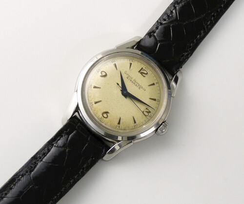 Genuine Girard-Perregaux Gyromatic Automatic Watch features a round case~Gun Metal Blue hands--Dauphine hour and minute hands and a stick second hand with a paddle back. The silver military style brushed silver dial has beautiful slightly golden-yellow patina which beautifully contrasts with the gun metal blue hands (not as yellow as some images may suggest). In the images the dial appears spotty but in hand it truly is not observable--actually, was suprised at the photos showing some spotting--the high contrast lighting/photography truly accentuates color/tonal differences--watch shows MUCH NICER in hand. The military style second markers with 1/5 second hash marks and numbers for every five seconds. Applied Arabic cardinal numbers and Arrow hour markers.