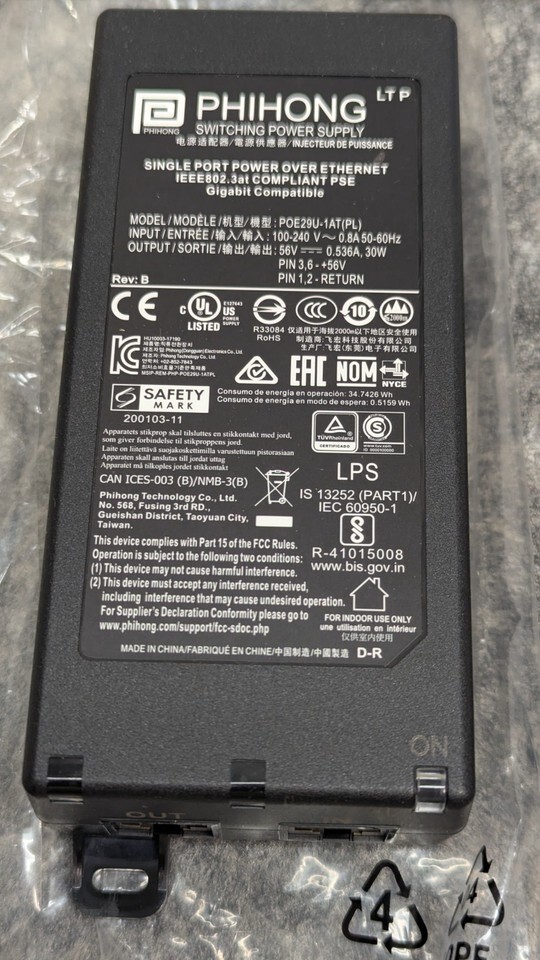 Phihong POE29U-1AT Gigabit POE Power Over Ethernet Injector 56V 30W New