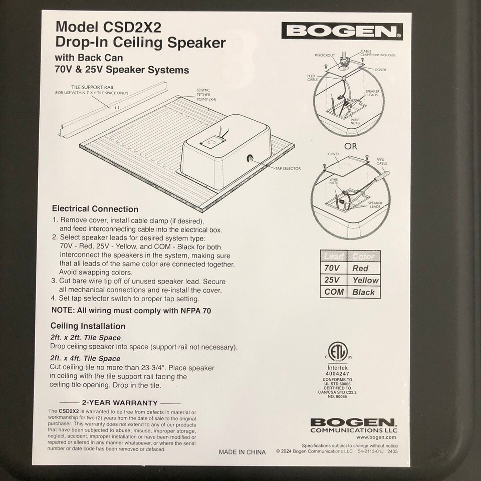 Bogen 70V/25V Drop-In Ceiling Speakers CSD2X2 - PAIR NEW/OPEN BOX - READ