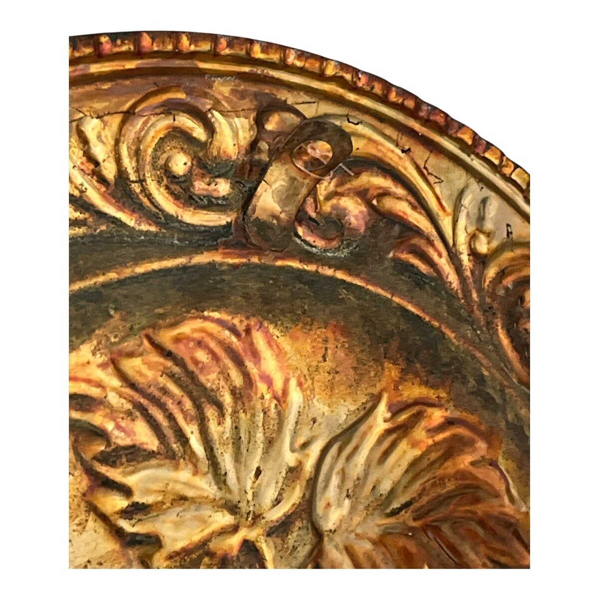 Good vintage condition with patina, oxidation, and surface wear consistent with age. The right edge has a **slight bend** visible in photos. This does not affect the overall display and the plate still hangs properly.
