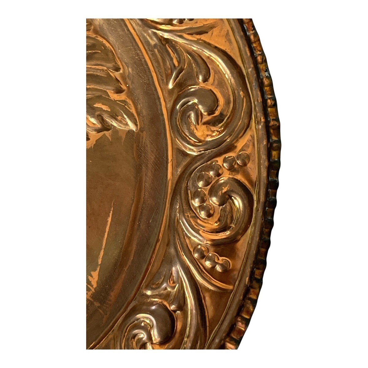 Decorative copper wall plates like this were popular in mid-century kitchens and dining rooms and add rustic farmhouse charm or vintage Italian character to a space.