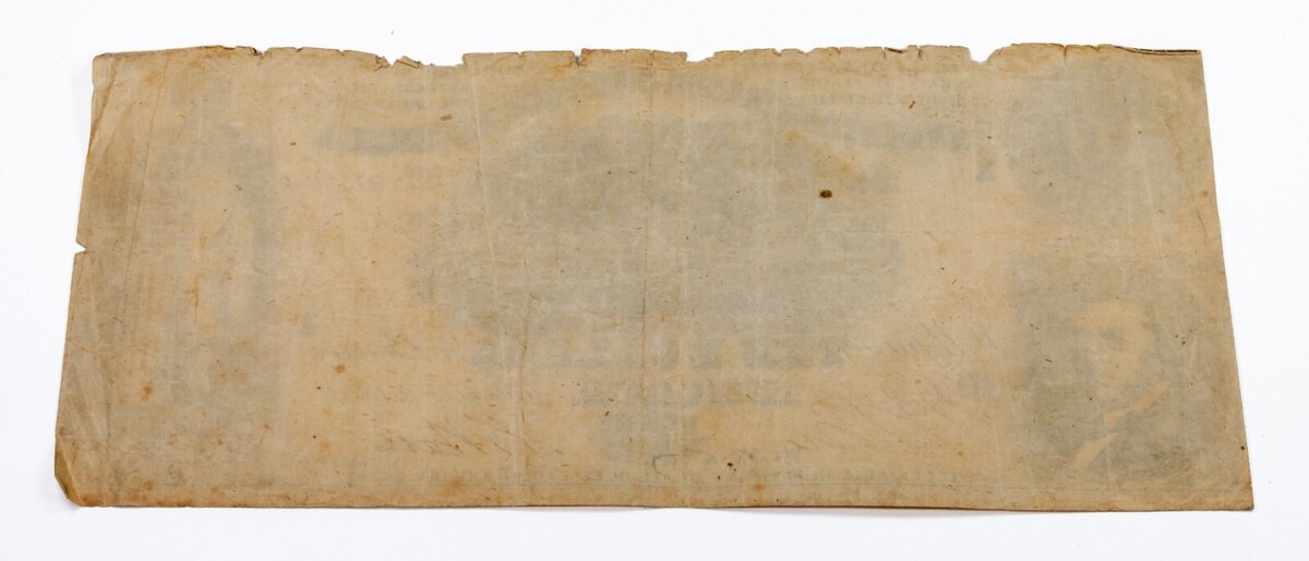 Note is in Fine Condition. Margins along top show fraying and tears. Vertical folds and some minor discoloration. No pinholes. See photos for details.