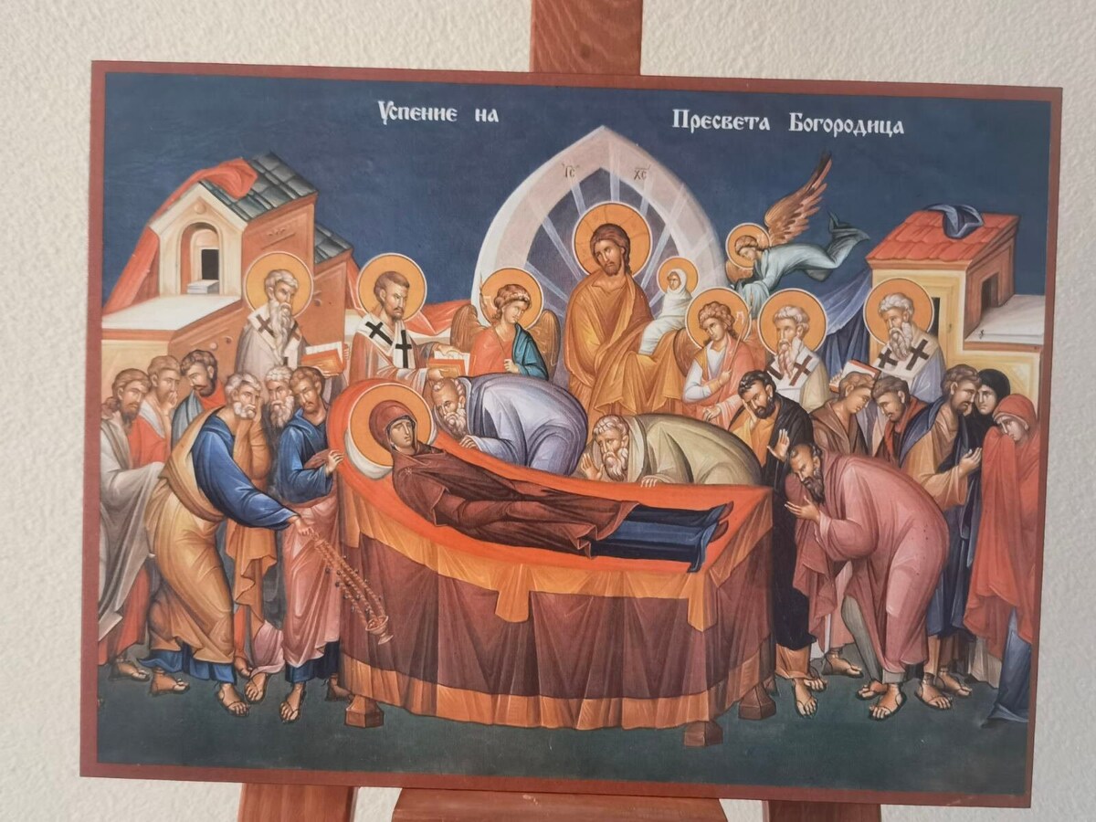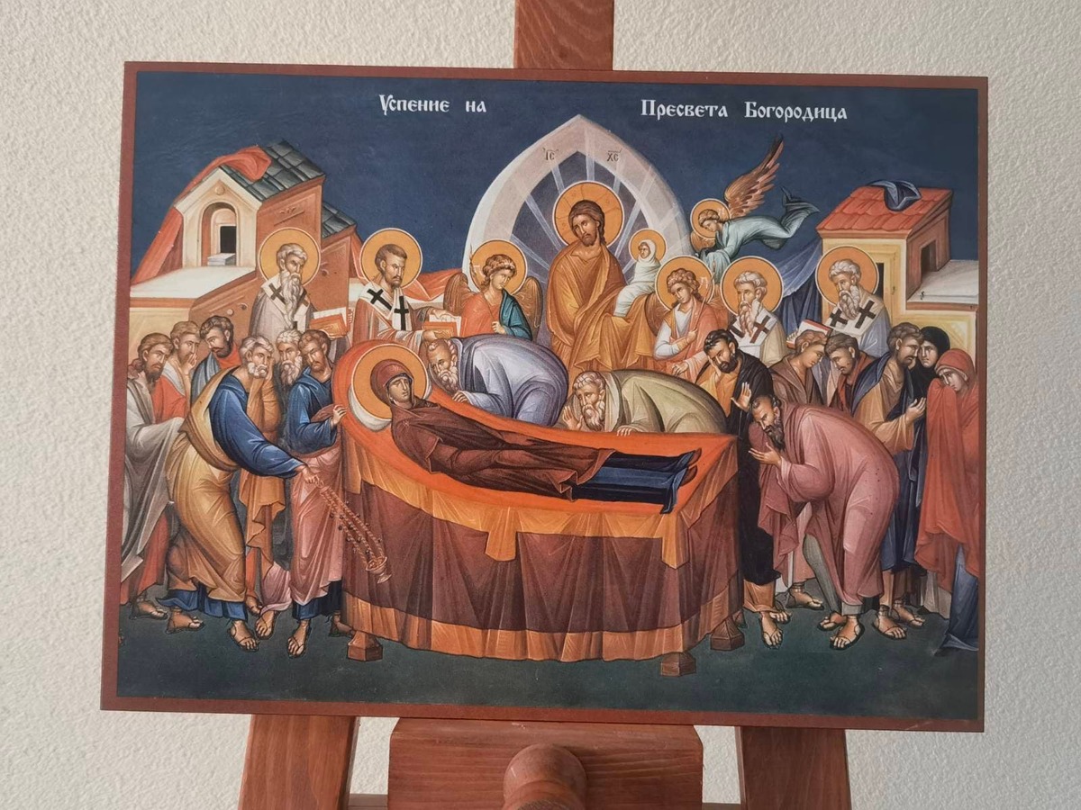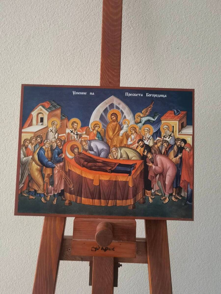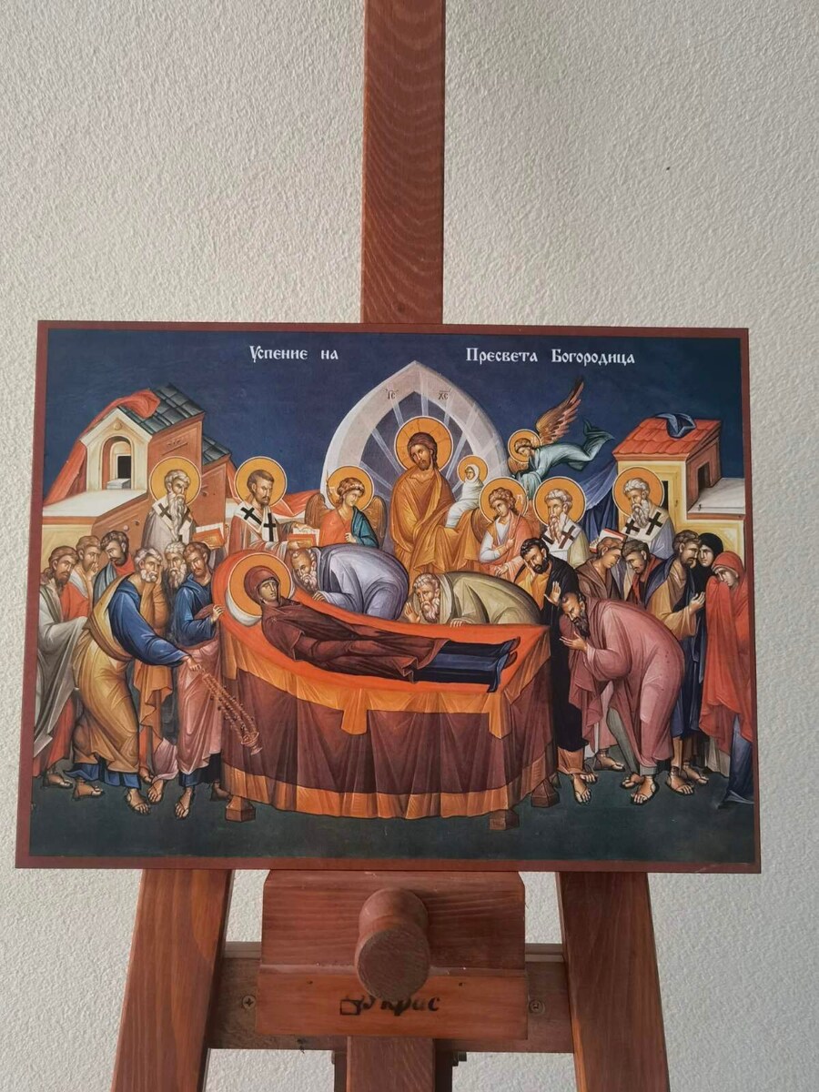 This is an large Orthodox Christian Icon of Dormition of the Mother of God, Holy Mary. It is a fest day for both Western and Eastern Christians, with a two weeks deference in date of the fest. Western Christian celebrate it on 15 August and Eastern Christians on 29 August as one of the biggest fest days in Christianity.