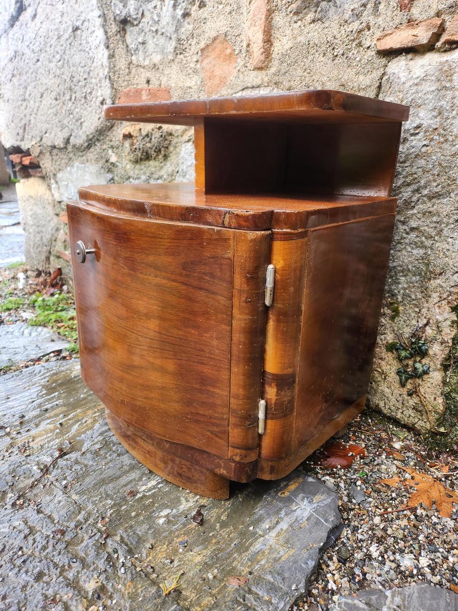 This is an antique nightstand, bedroom side table made in the 1930s. It is made of wood. The nightstand is in authentic art deco style and design. It is kept in a very good condition for its age, without areas of rotten wood. There are visible some signs and scratches of use/age. Also visible very small holes caused by wood warms.
