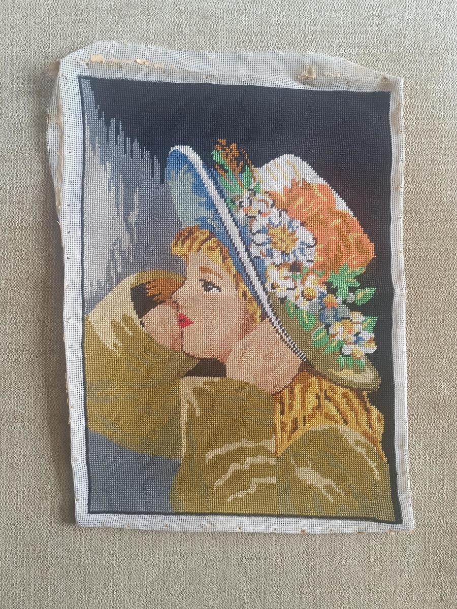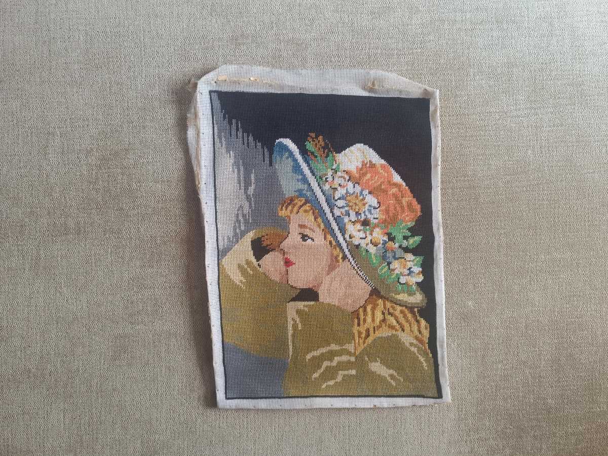 This is a lovely retro hand embroidered gobelin needlepoint, finished handmade tapestry, made in the 1960s or the 1970s. It is a lovely looking hand embroidered tapestry, picture of a girl with a hat. The gobelin is made on a canvas and used high quality mercerized cotton colored threads.