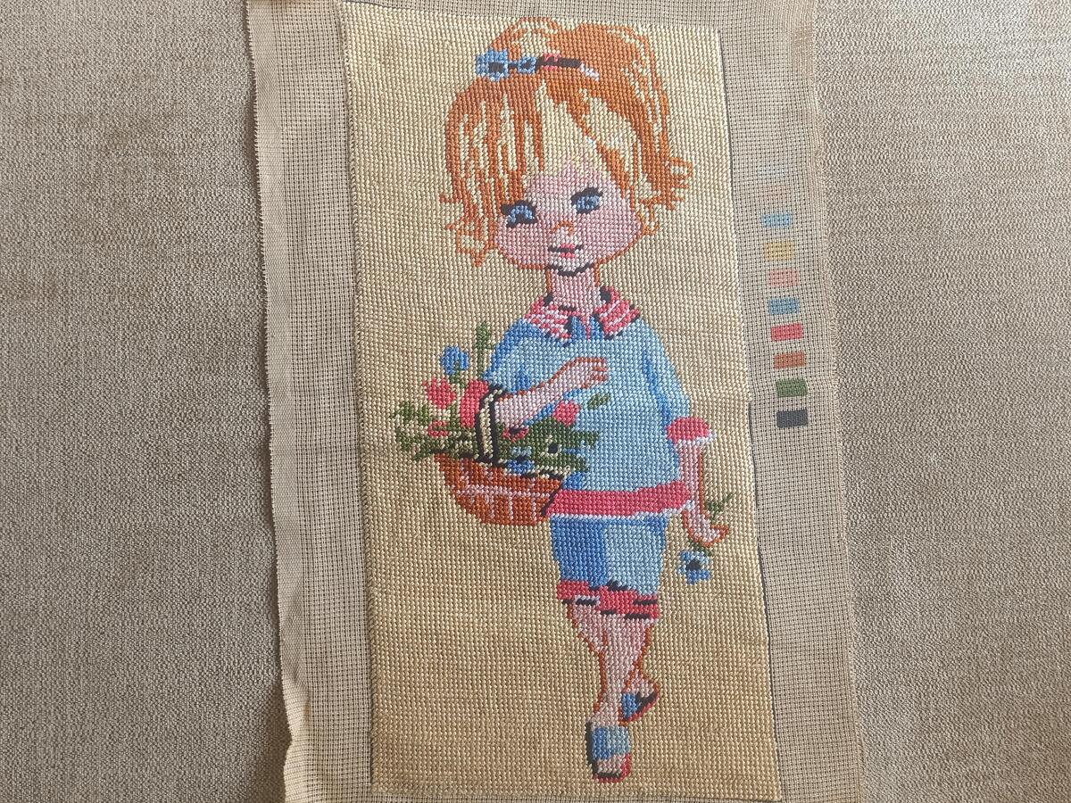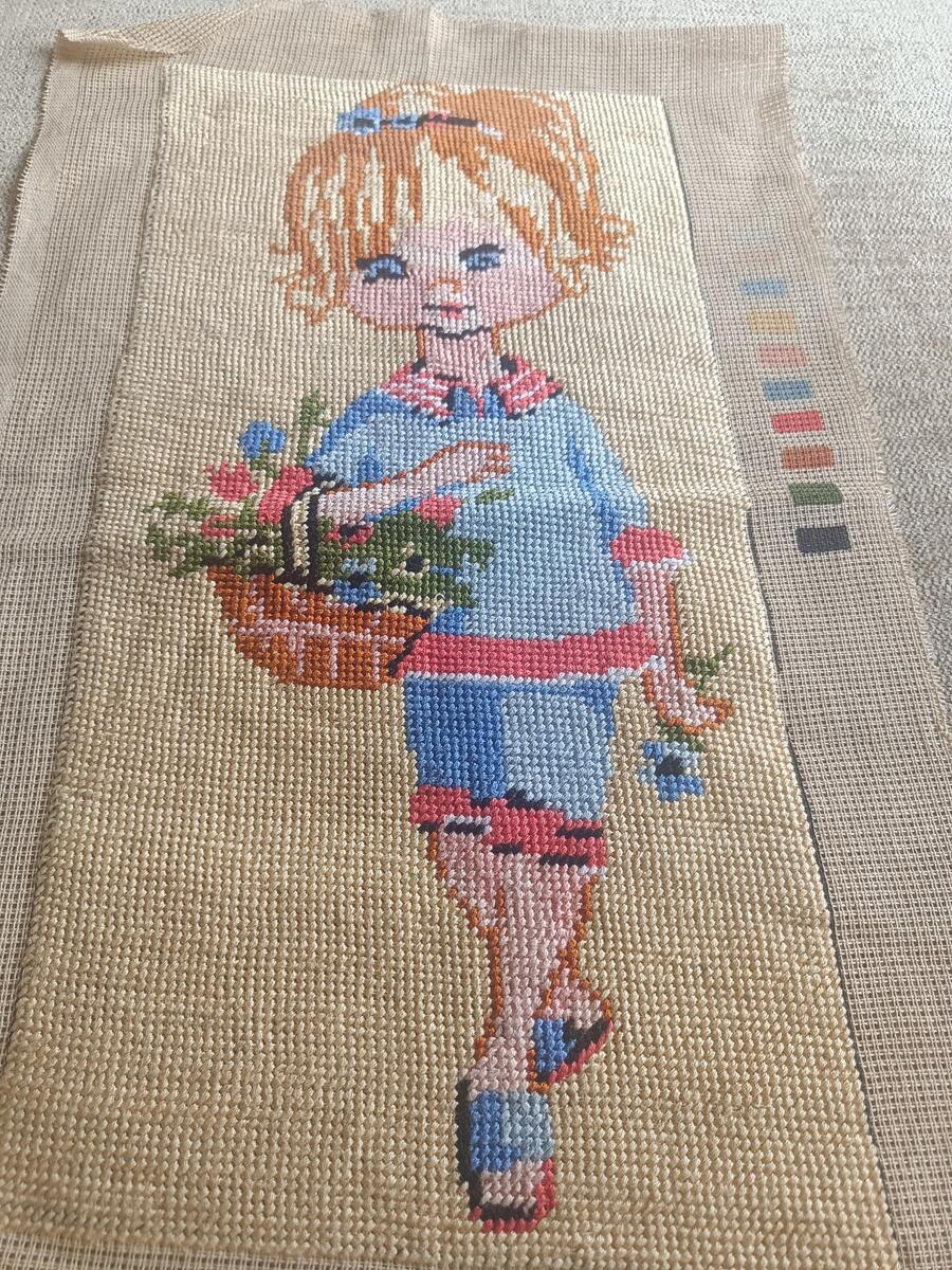 This is a lovely retro hand embroidered gobelin needlepoint, finished handmade tapestry, made in the 1960s or the 1970s. It is a cute looking kid's hand embroidered tapestry, picture of a girl with flower basket. The gobelin is made on a canvas and used high quality mercerized cotton colored threads.
