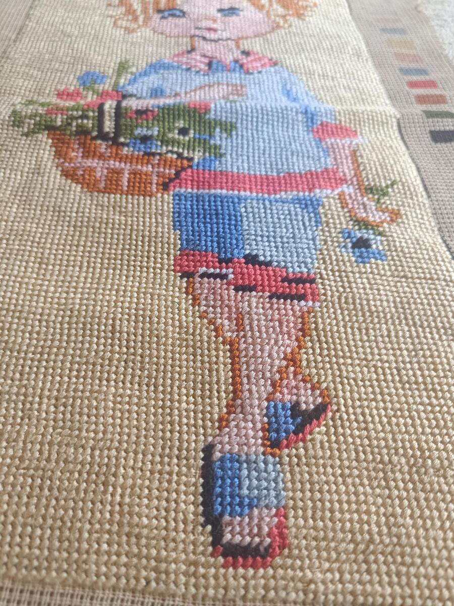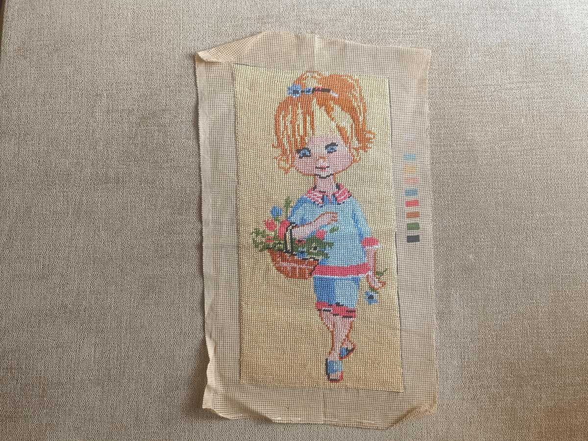 Girl with flower basket tapestry, handmade finished needlepoint tapestry, retro