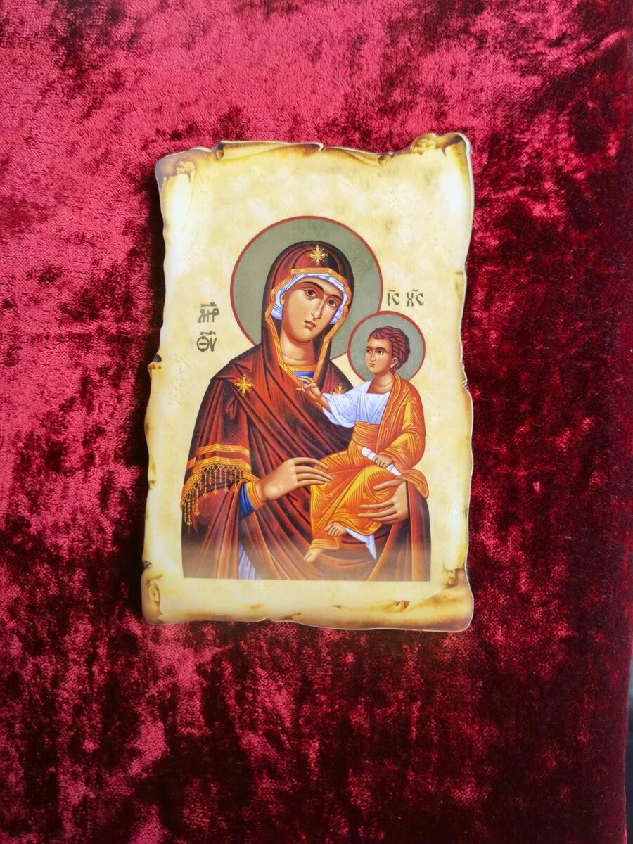 An Icon is a religious work of art, most commonly a painting in the churches of the Eastern Orthodox churches. They are usually painted or printed on wood panels such as this one, manufactured for personal use.