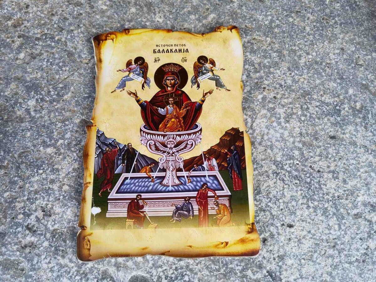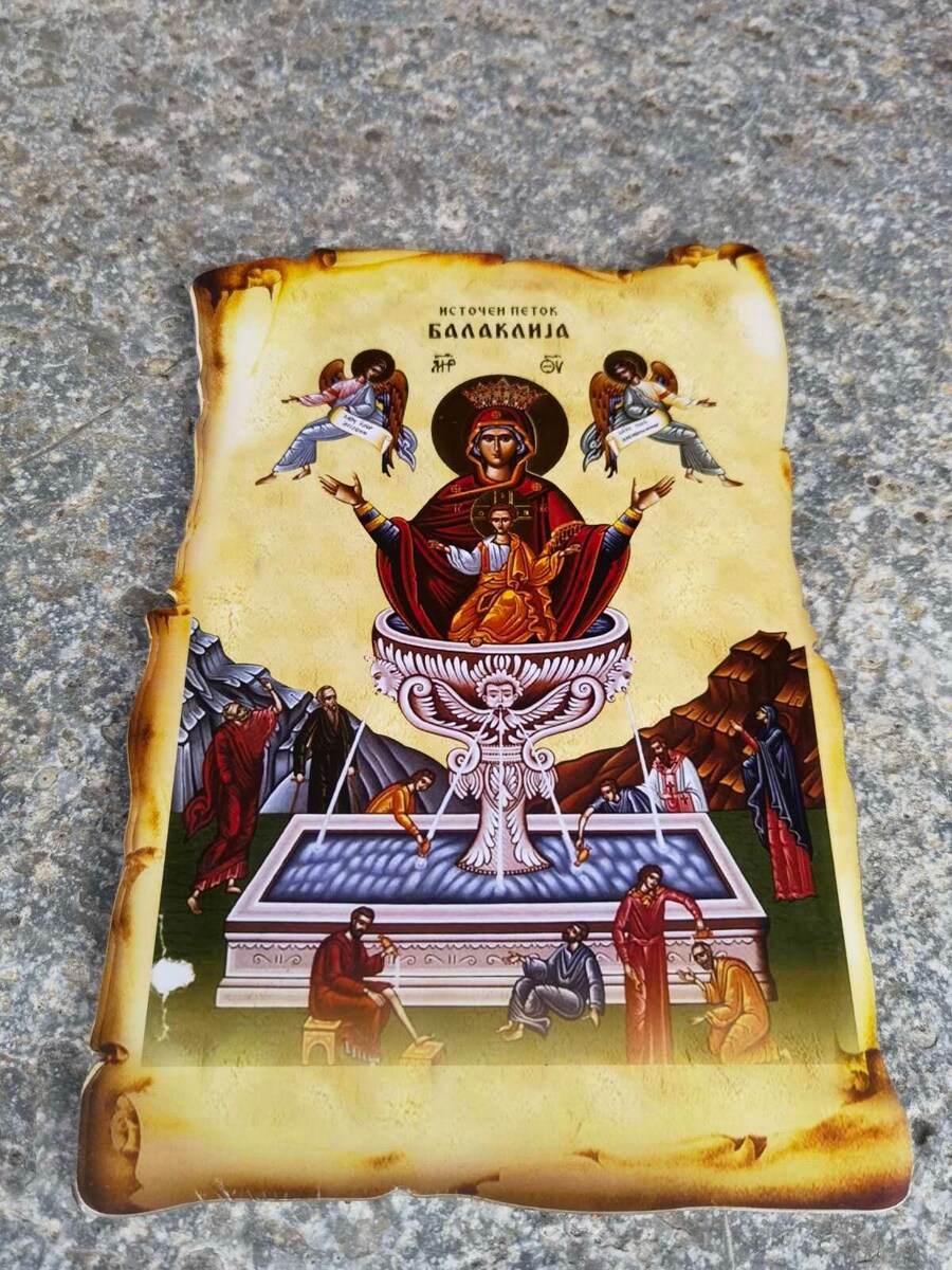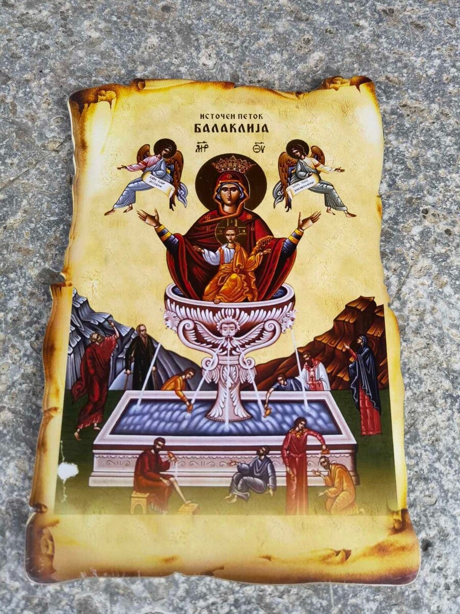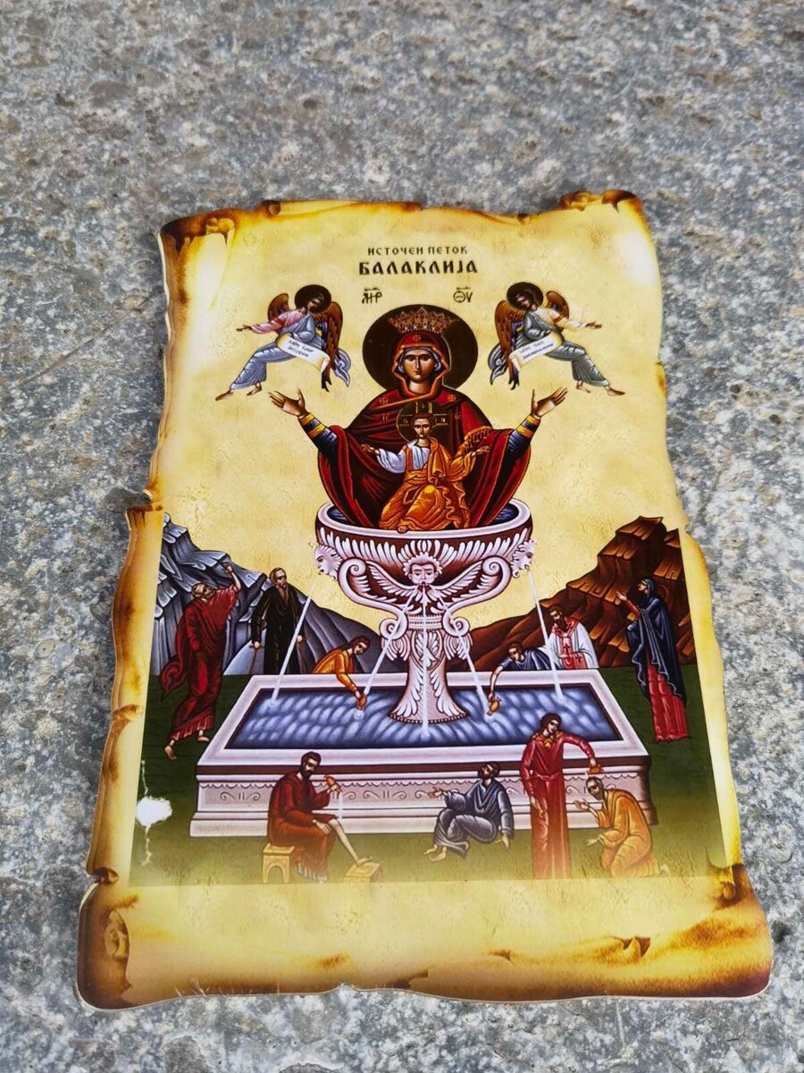 An Icon is a religious work of art, most commonly a painting in the churches of the Eastern Orthodox churches. They are usually painted or printed on wood panels such as this one, manufactured for personal use.
