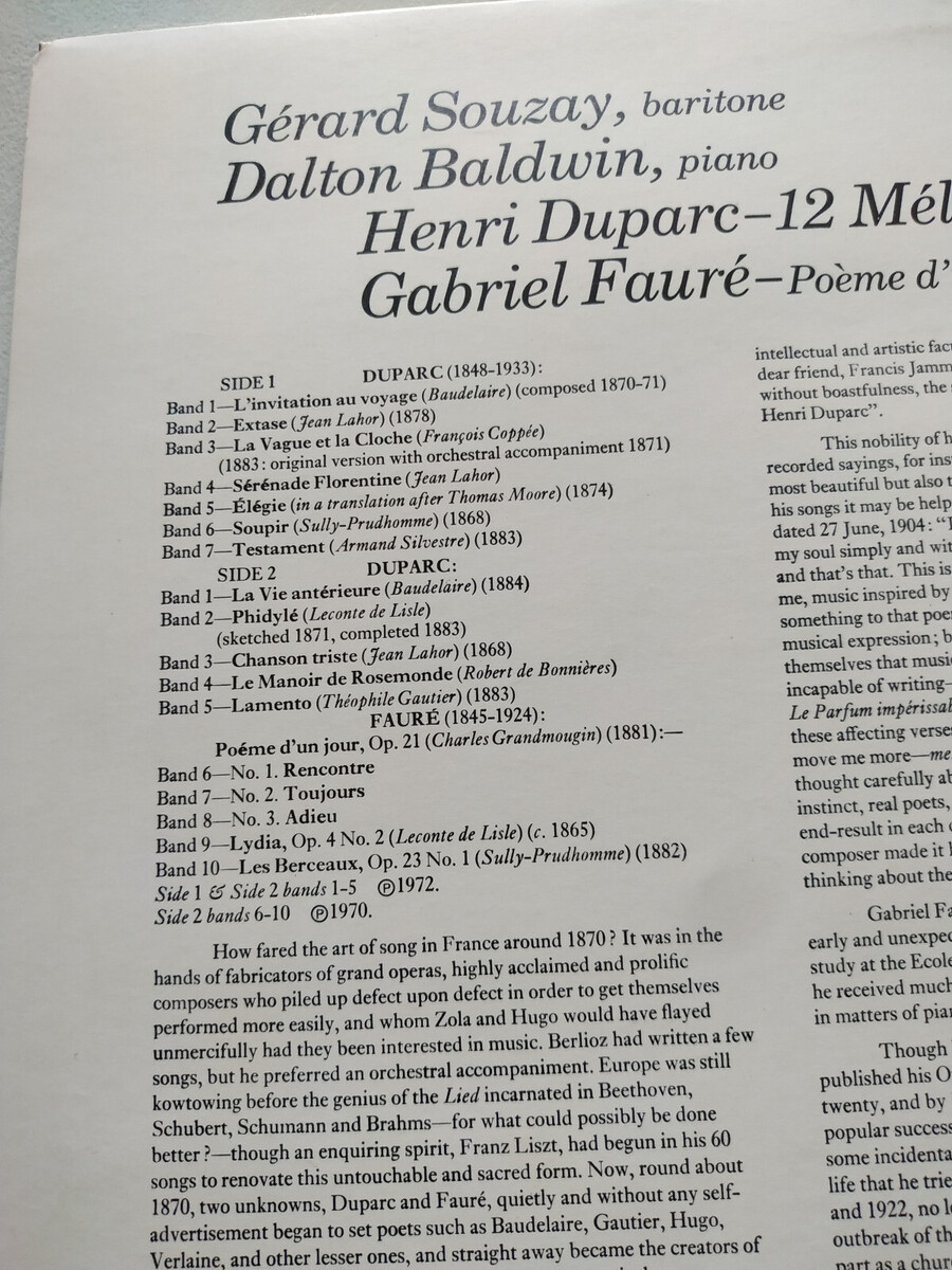 Gerard Souzay Duparc 12 Melodies Faure HQS 1258 1972 - LP 12" vinyl VG/VG Am