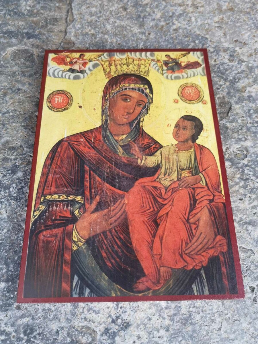 An Icon is a religious work of art, most commonly a painting in the churches of the Eastern Orthodox churches. They are usually painted or printed on wood panels such as this one, manufactured for personal use.