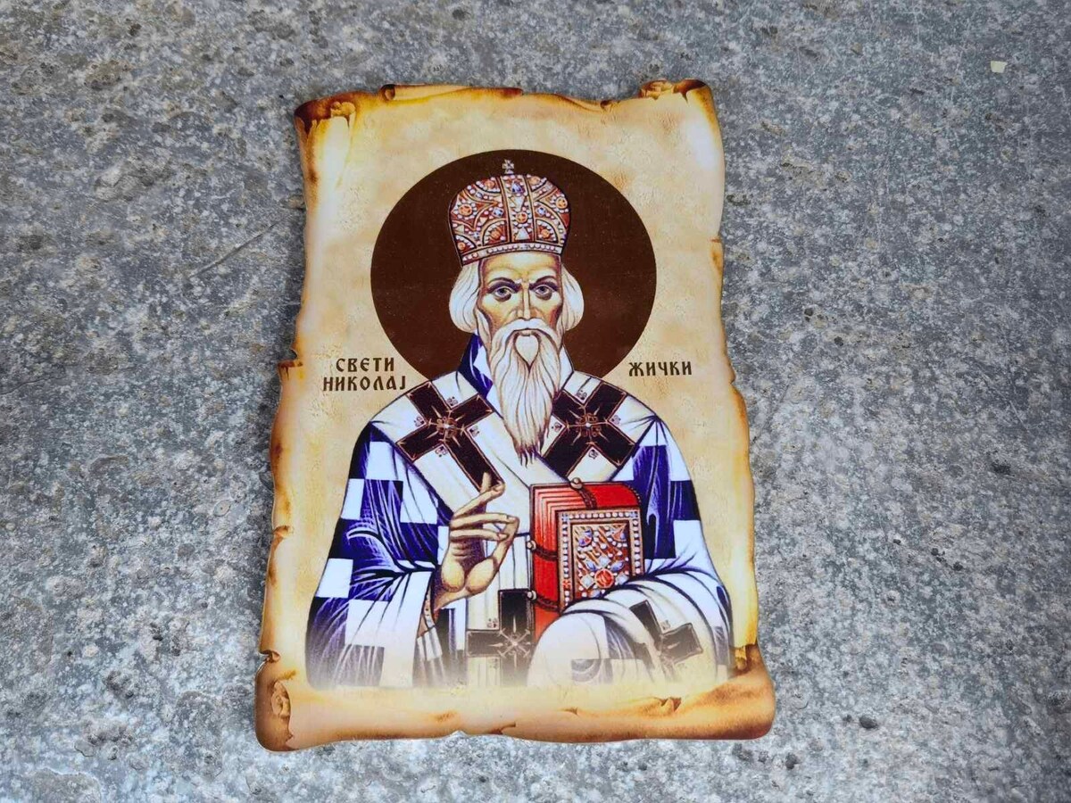 This is an Orthodox Christian Icon of bishop Nikolaj Zicki. Nikolaj Velimirovic was a bishop of the eparchies of Ohrid and Zica in the Serbian Orthodox church in the period of 1920-1956. He was an influential theological writer and highly gifted orator, often referred to as new John Chrysostom.