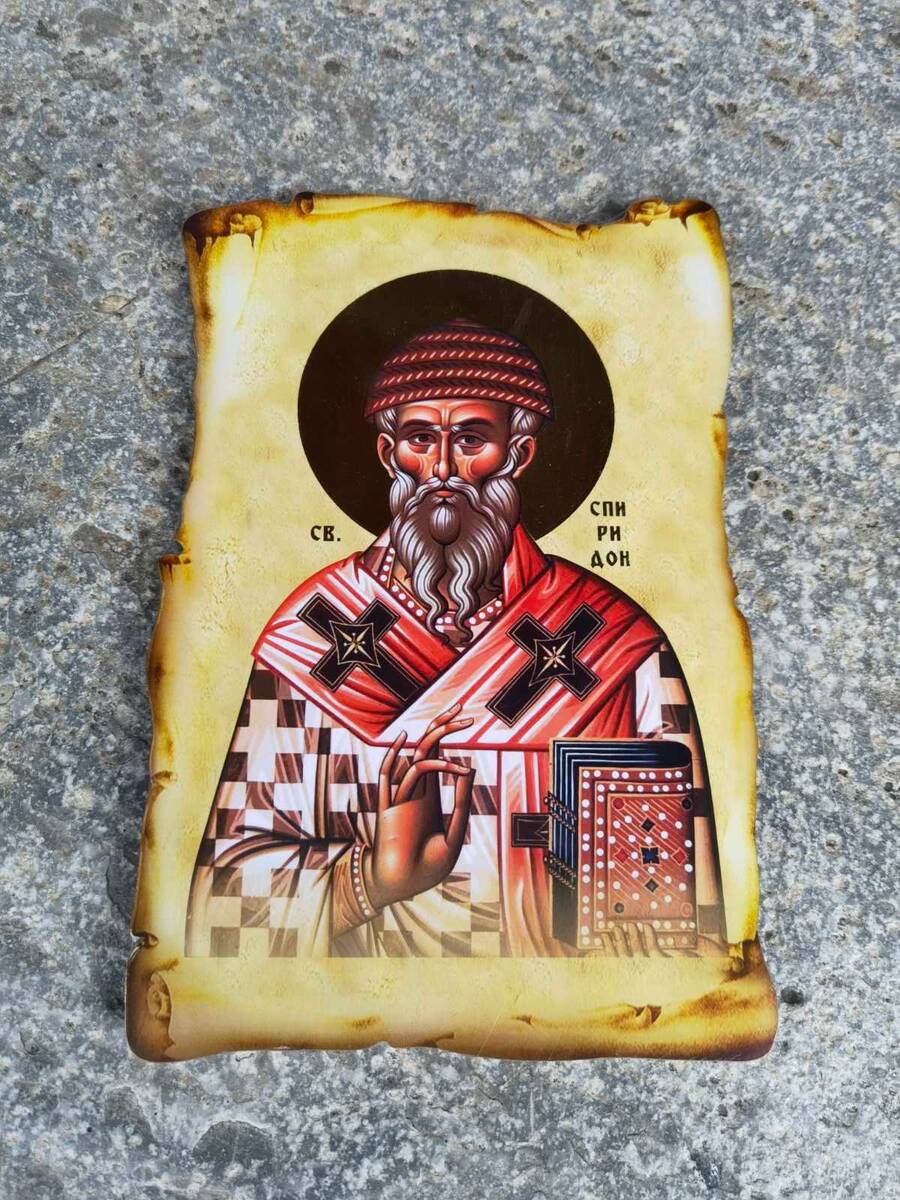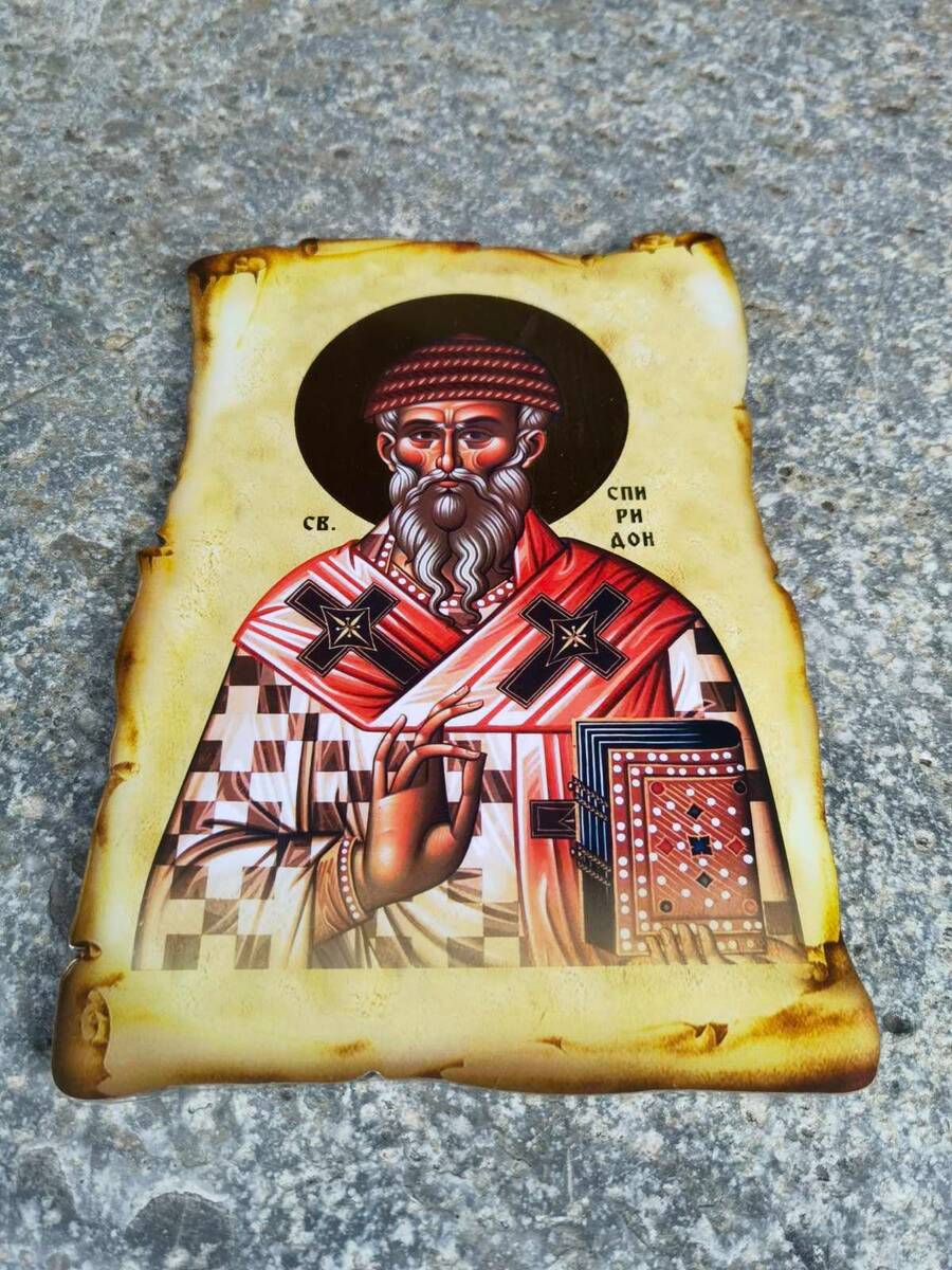 This is an Orthodox Christian Icon of Saint Spyridon. It is a saint honoured both in Eastern and Western Christian traditions. In the Eastern churches its feast day is on December 12 and in the Western churches the feast day is on December 14.