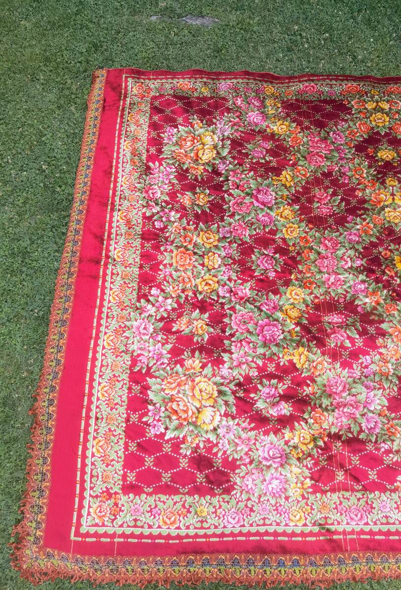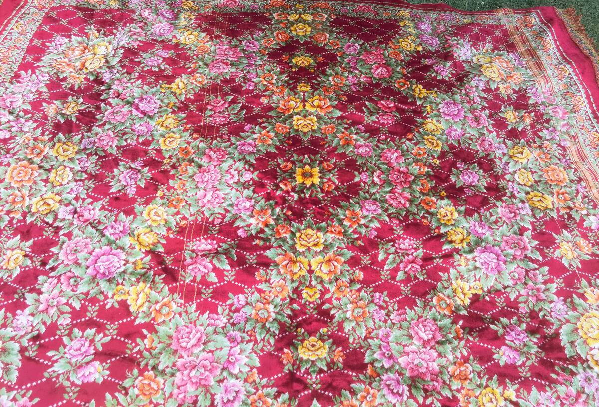 This is a beautiful velvet bed cover from the 1980's. It was made in Italy and made of high quality Italian velvet, by P S the most famous Italian manufacturer known by world's best velvet . The bedspread is in floral pattern, easy to fit in every home interior. The bedspread is tassels decorated at three sides.