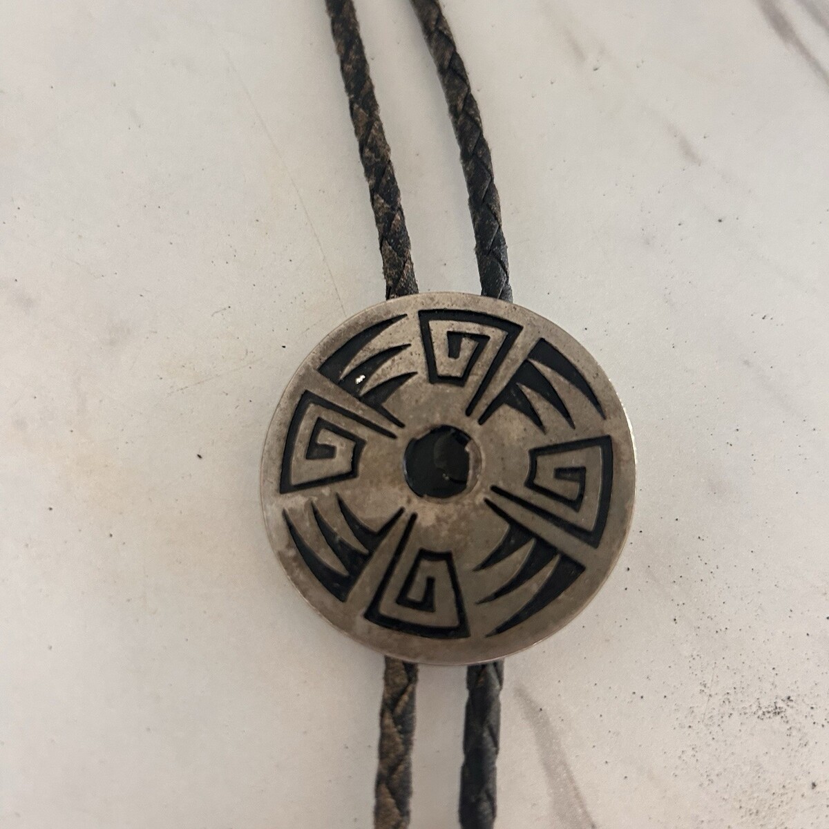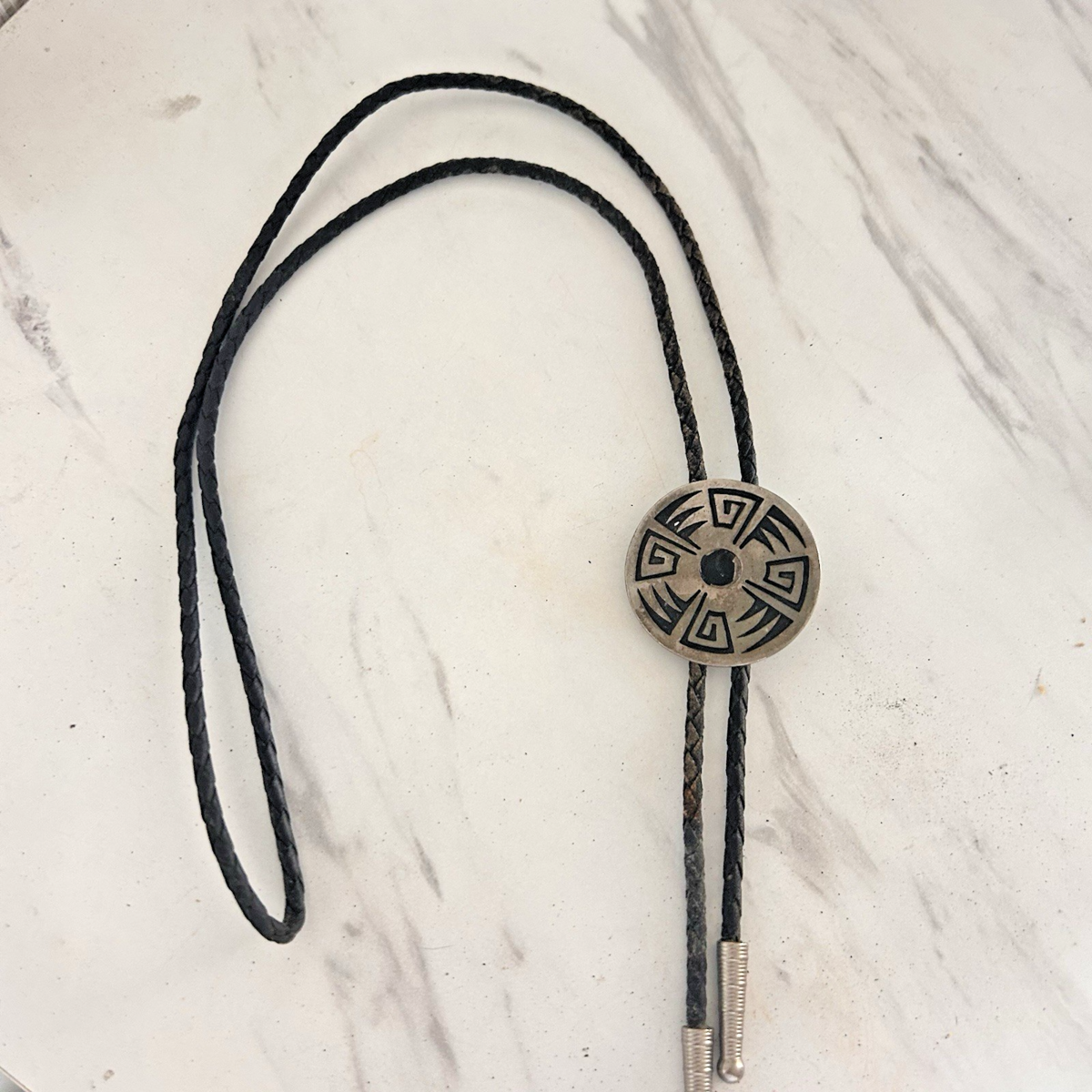 Vintage Southwestern Design Bolo Tie Pewter w/ Leather Tie 1.5" Diameter