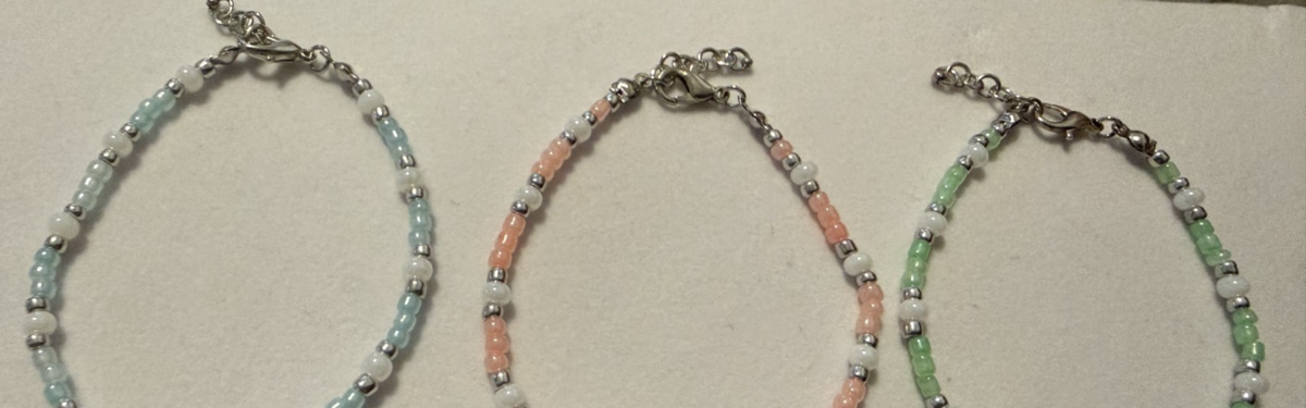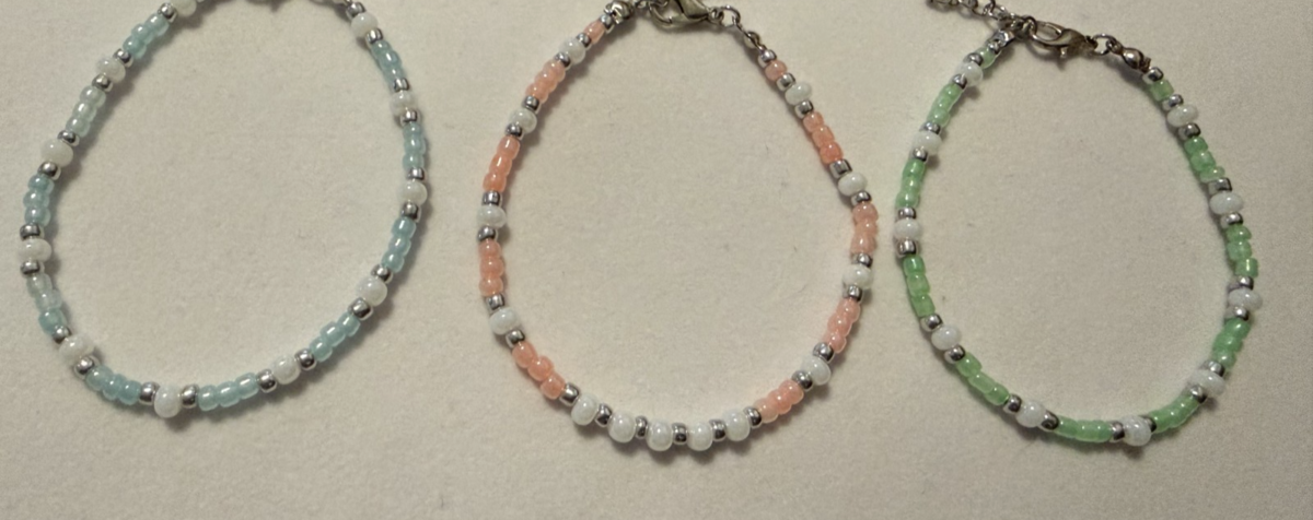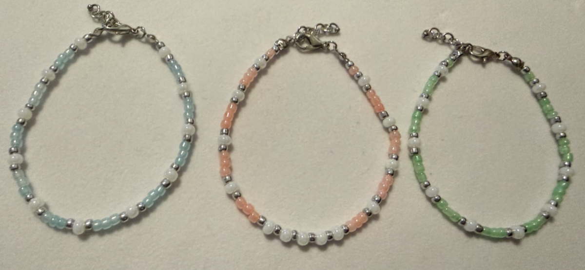 Set of three (3) handcrafted glass seed bead bracelets in Pastel Blue, Pink and Green, accented with silver and synthetic pearl spacer beads. A great addition to any jewelry collection, the bracelets are suitable for a variety of occasions. Strung on stainless steel wire and finished with a lobster clasp, each bracelet expands from 7 - 8 inches.