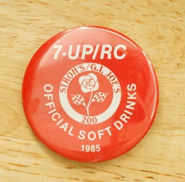 Vintage Pin Button 7UP RC Cola Strohs GI Joes 200 Race Official Soft Drink 1985