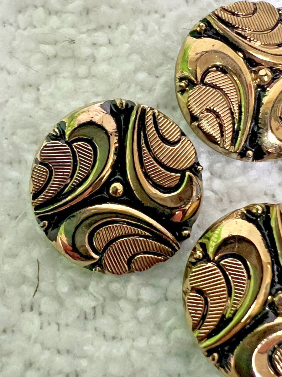 4 Vintage Gold Painted Ornate Design Black Glass Sewing Buttons 5/8" Wide. Very good used condition ornate gold swirling pattern painted on black glass round buttons, measure approx. 5/8" wide. Coloring in very good condition, no damage to glass buttons. See pictures.