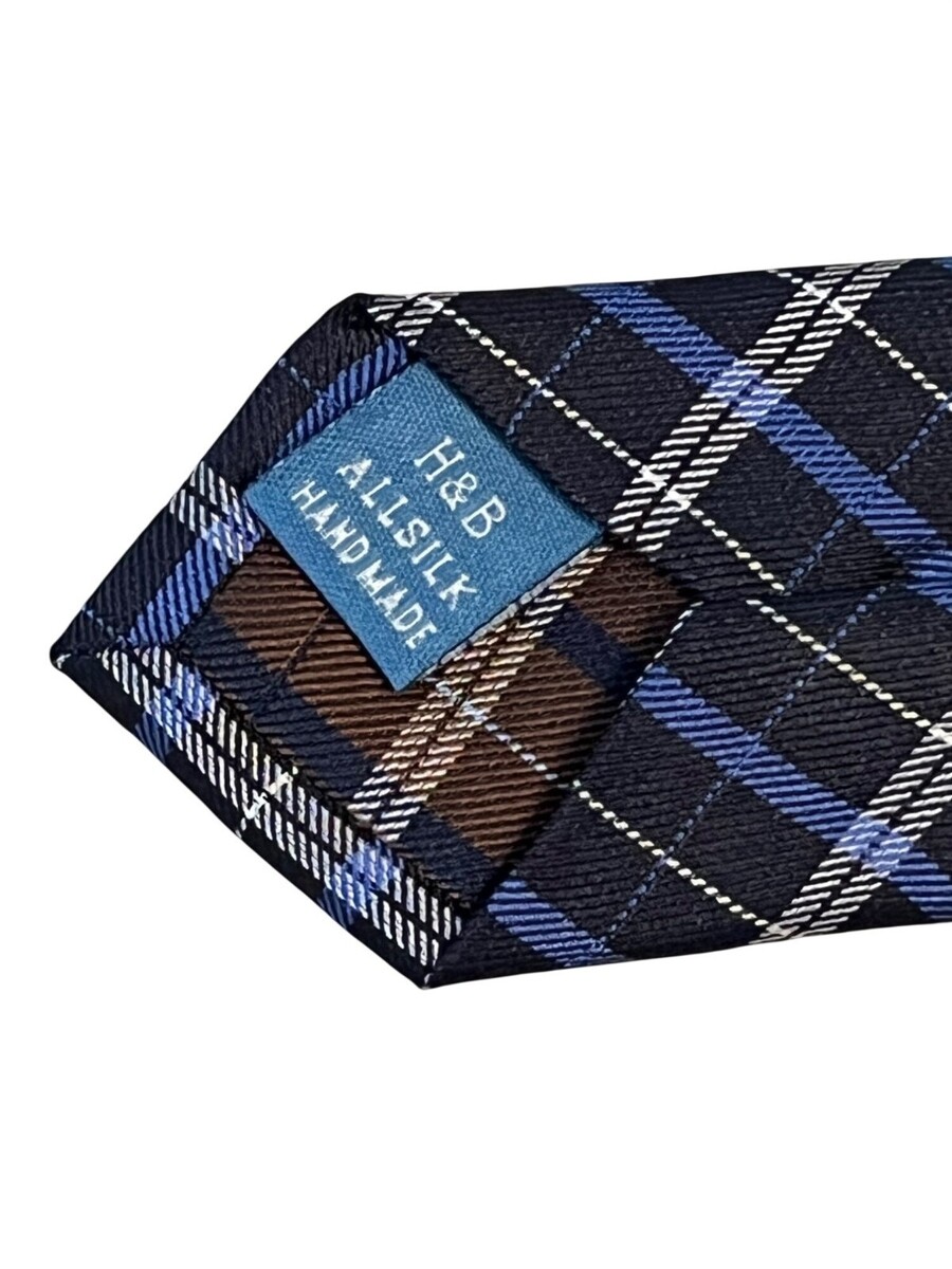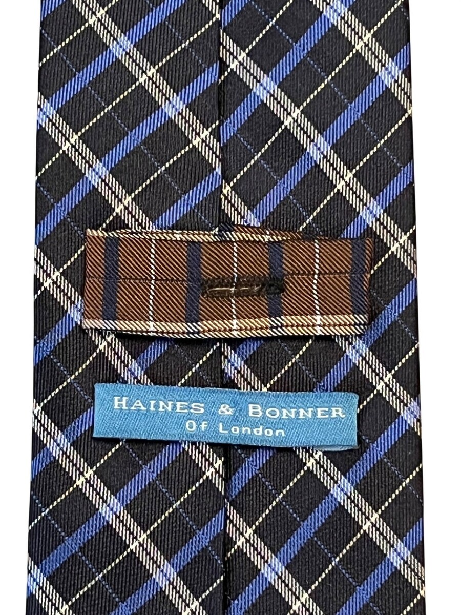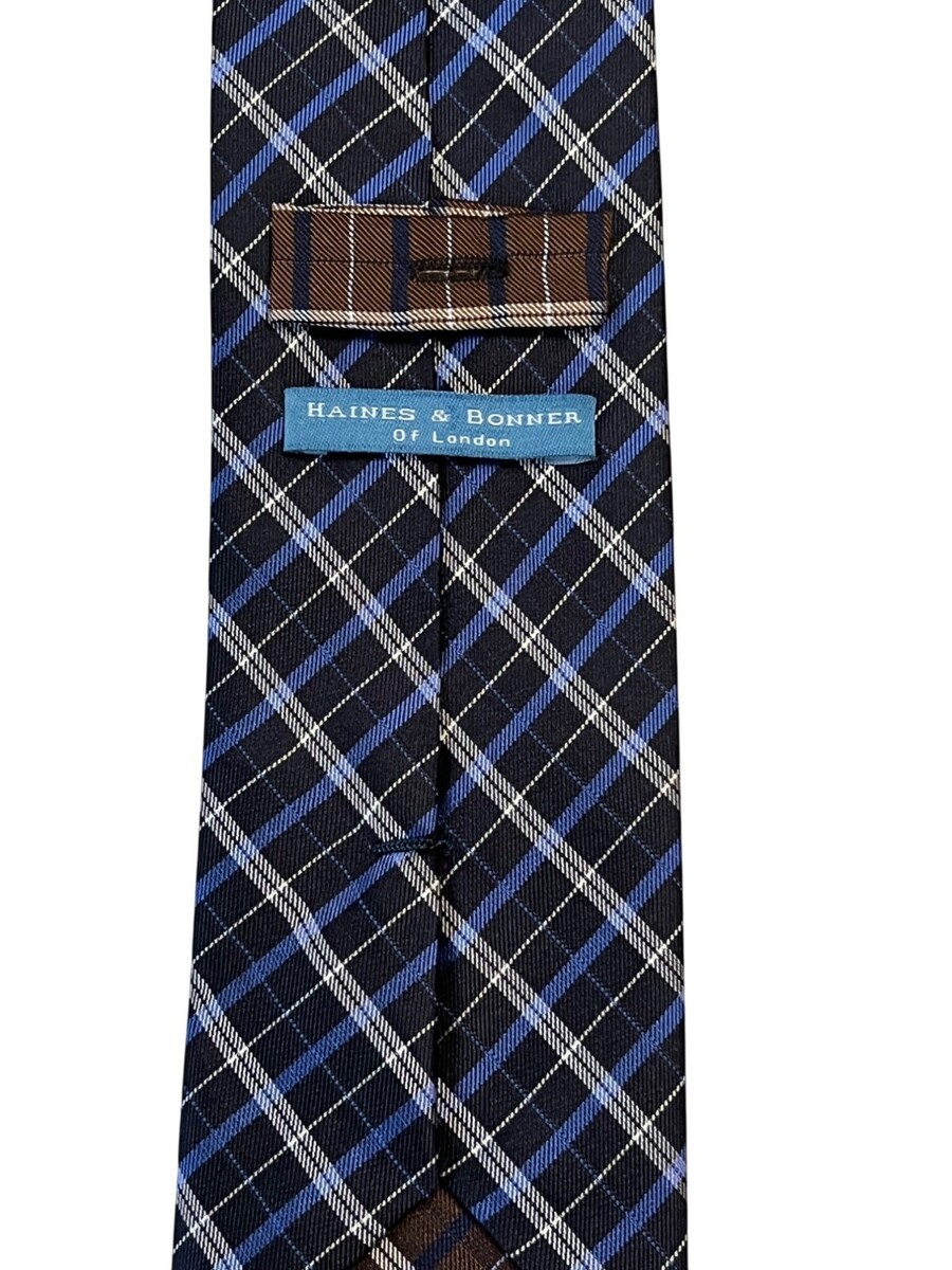 Classic silk necktie by Haines Bonner of London featuring a refined blue plaid pattern with intersecting white and brown lines. The timeless design makes it suitable for business wear, formal events, or everyday office style. Crafted from silk with a smooth finish and traditional pointed tip, this tie offers a polished look that pairs well with a variety of dress shirts and suits.