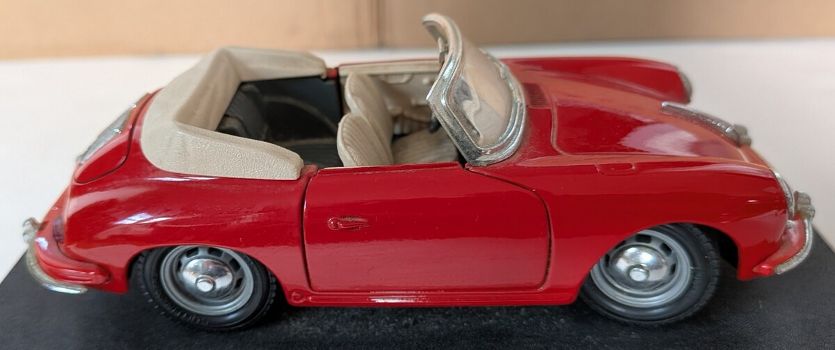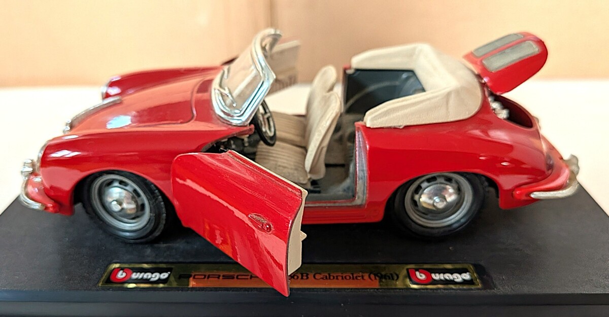 Bburago 1:24 Porsche 356B Cabriolet (1961) diecast model. New old stock (NOS) in excellent condition. Box has some scuffing on the edges and is mildly dented but solid overall.