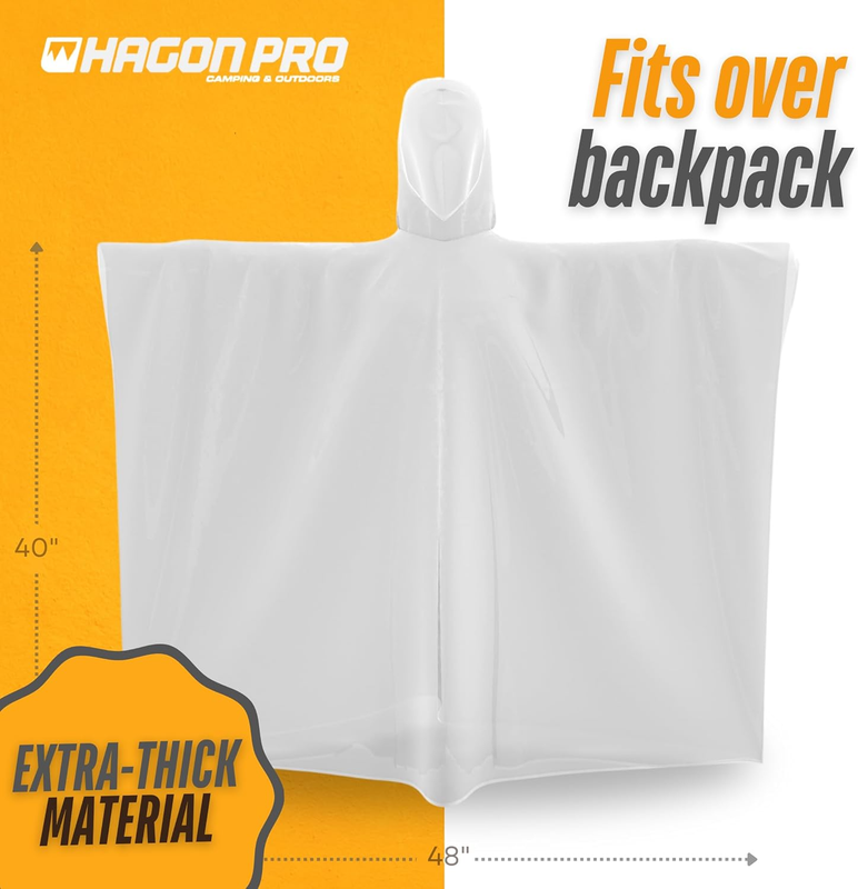Reliable Rain Protection On-the-Go: Stay dry and confident during sudden downpours with Hagon PRO disposable rain ponchos, offering full-length 48" x 40" coverage and a secure hood for complete weather protection. Perfect for commuters, festival-goers, emergency kits and preparedness kits, these transparent rain coats keep you ready for anything