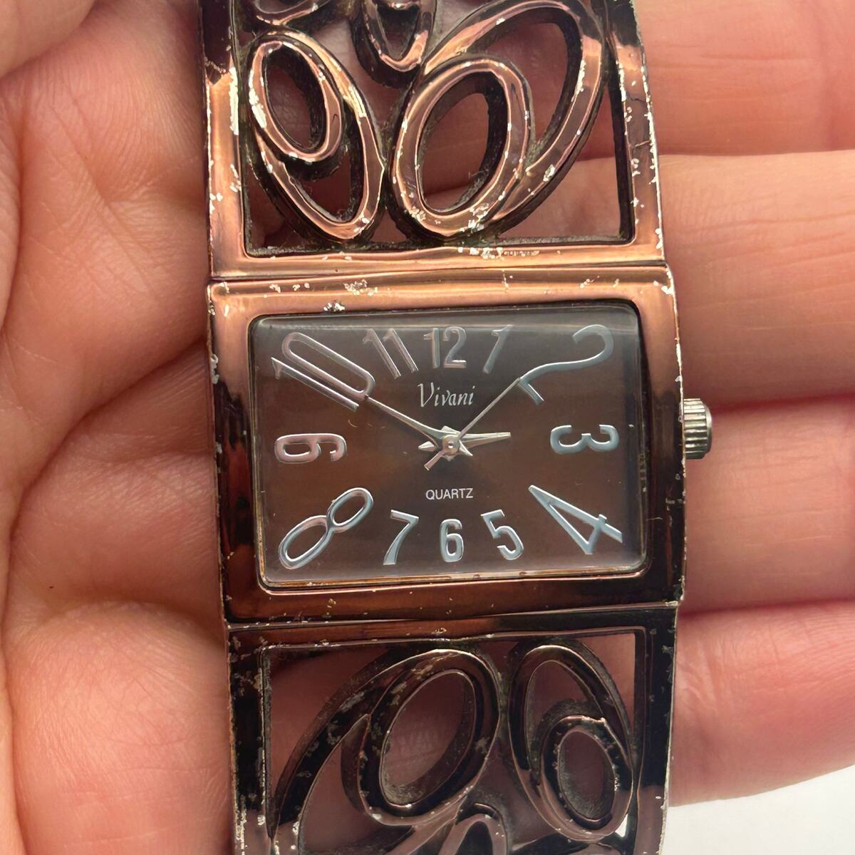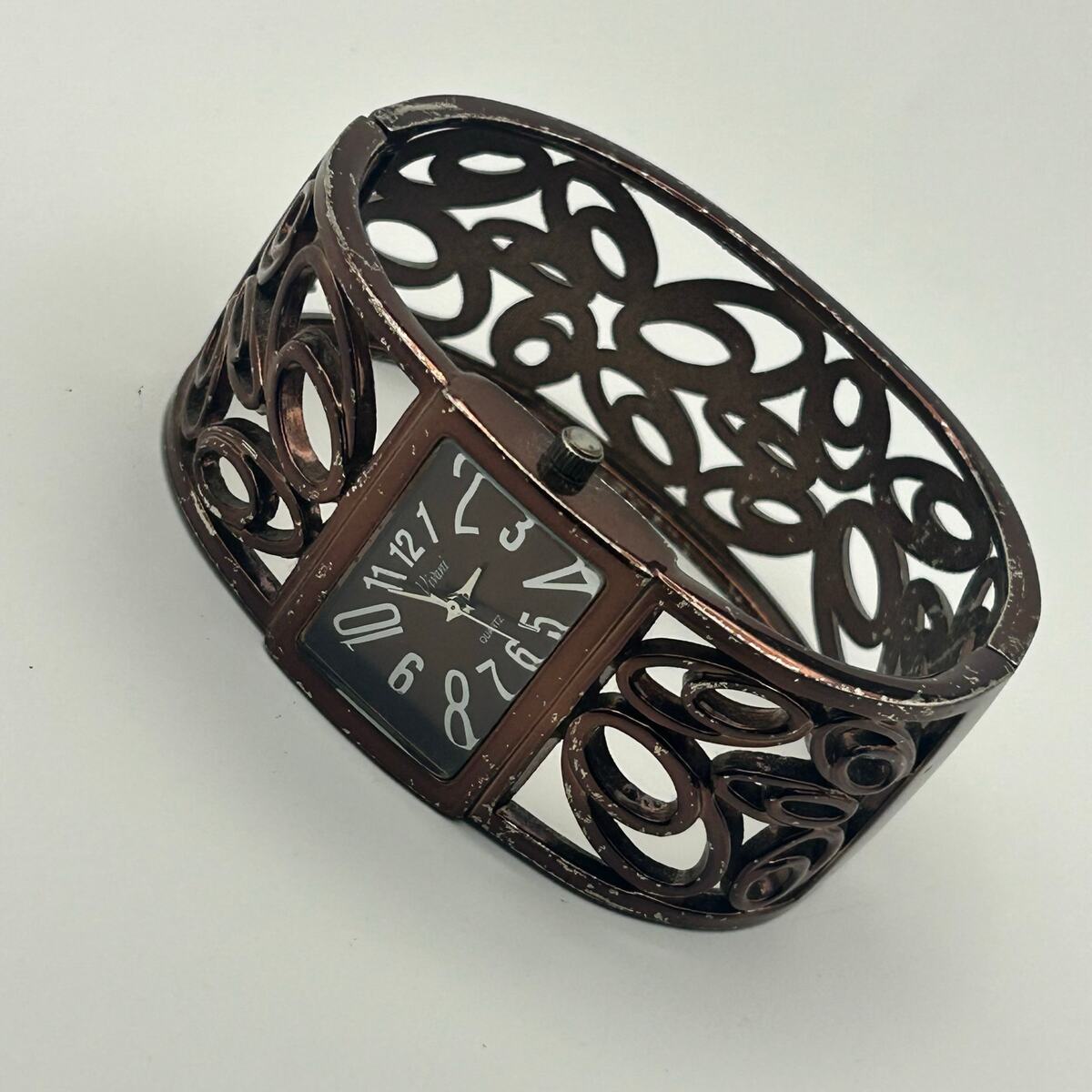 Vivani Women's Rose Gold Tone Wide Cuff Bangle Watch Working New Battery