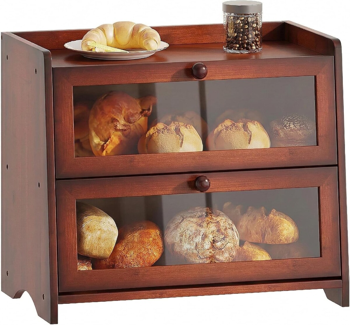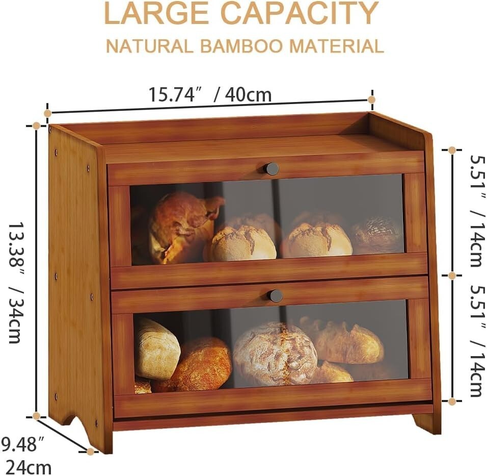 Two-Tier Bamboo Storage Solution: This elegant double-layer bread box features dual independent compartments with scratch-resistant acrylic doors. Crafted from eco-friendly bamboo in matte black, it effortlessly keeps artisan breads and pastries organized, preventing flavor mixing?ideal for sourdough and sweets storage.