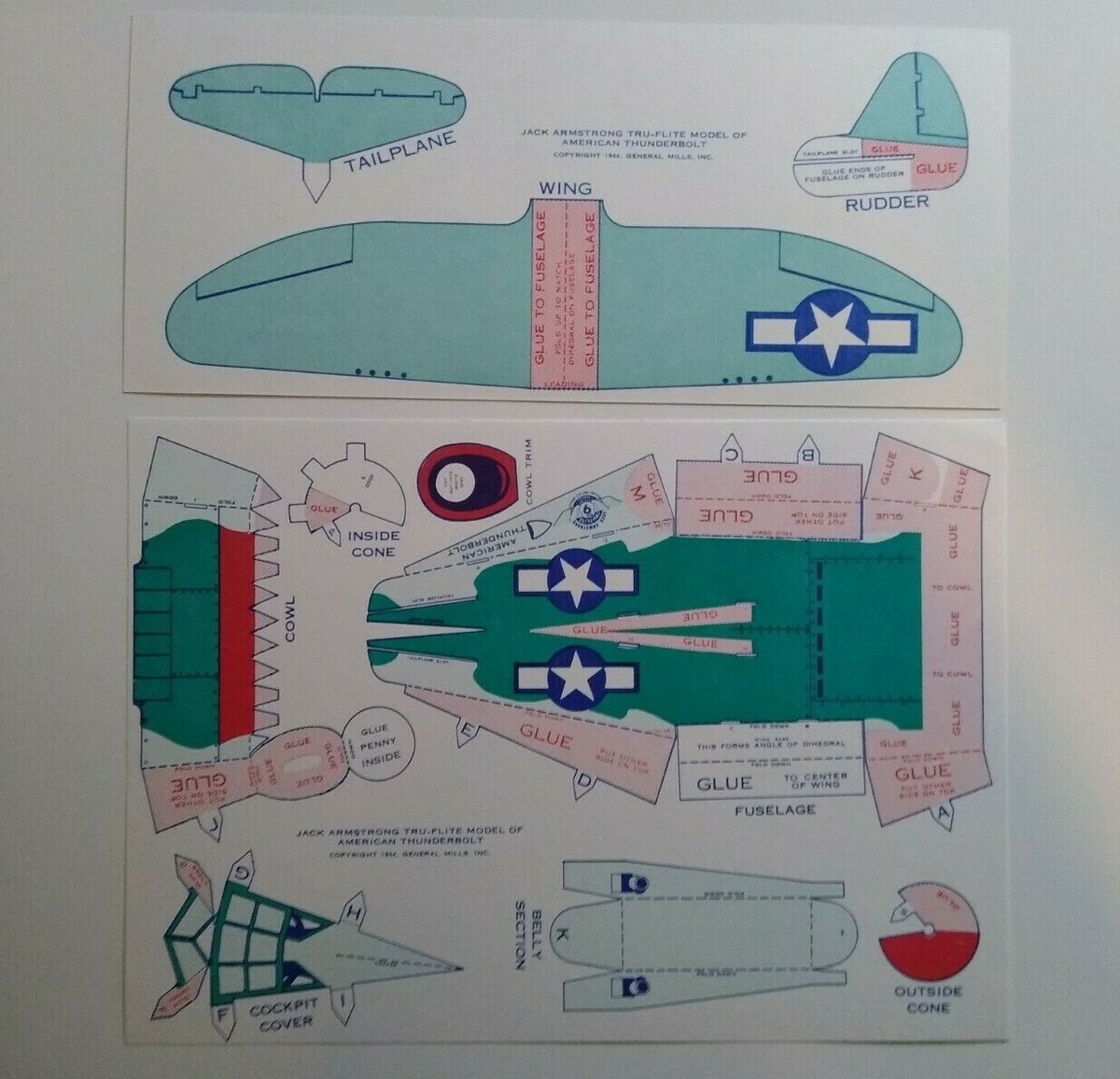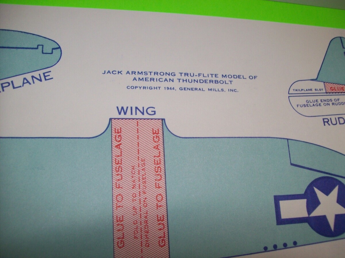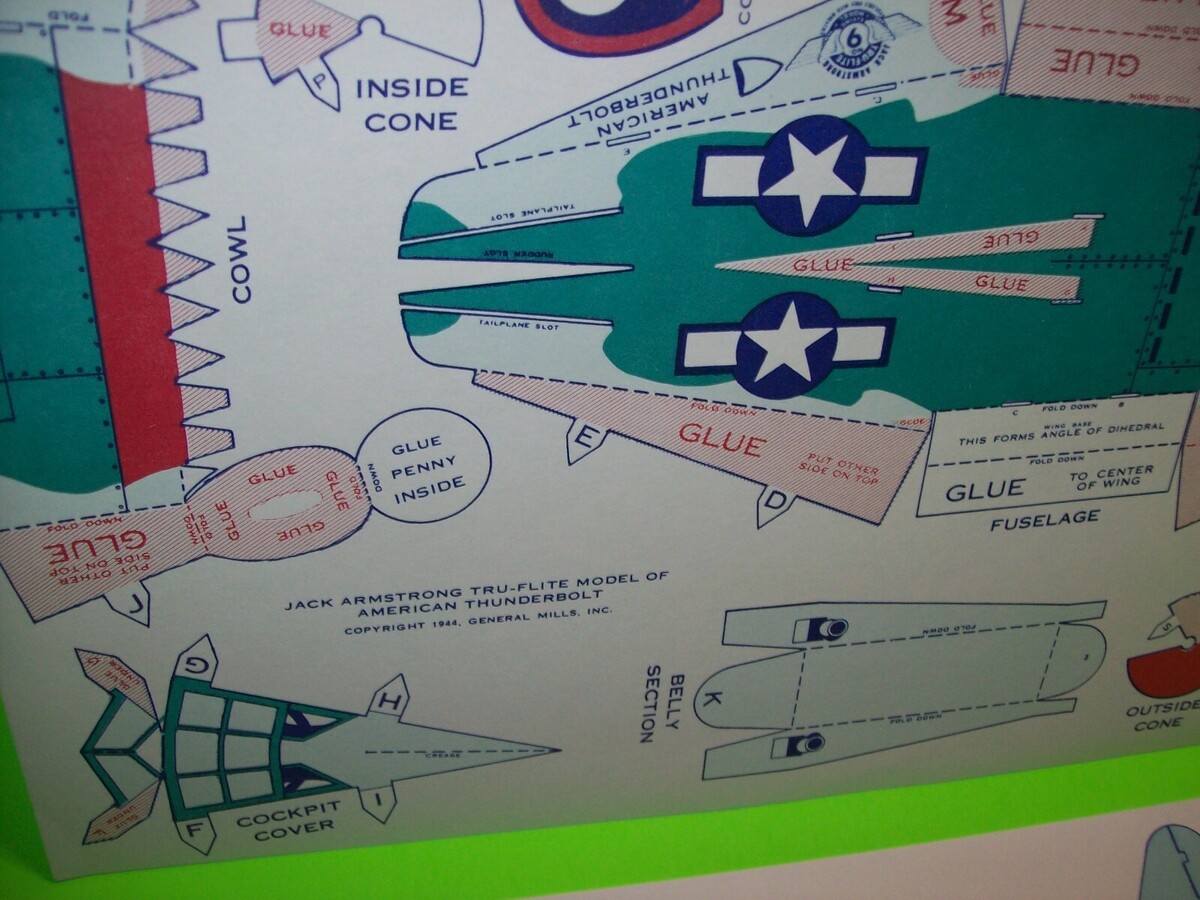 New old stock General Mills cereal premium paper cutout airplane. Comes in two parts as shown. The section with wings is a bit thicker. Copyright date is 1944. One sheet is 6" x 10.25". The other is 4" x 6".