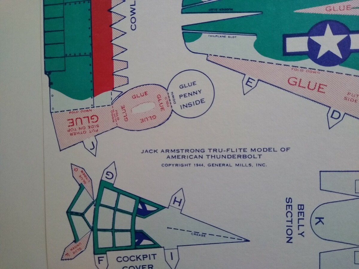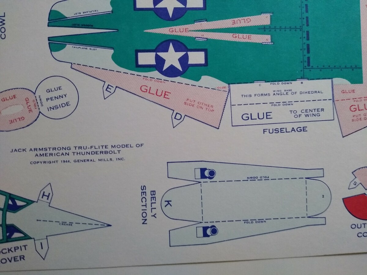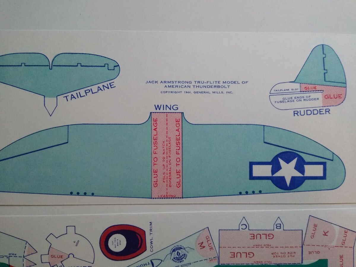 New old stock General Mills cereal premium paper cutout airplane. Comes in two parts as shown. The section with wings is a bit thicker. Copyright date is 1944. One sheet is 6" x 10.25". The other is 4" x 6".