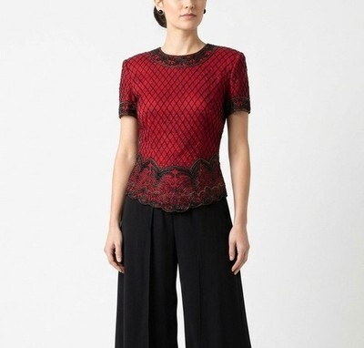 PAPELL BOUTIQUE EVENING BEADED BLOUSE WOMEN'S L 100% SILK VINTAGE RED FLORAL