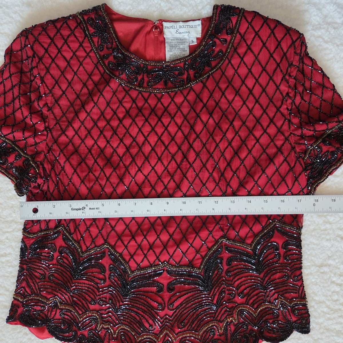 The Papell Boutique Evening Beaded Blouse is a glamorous and vintage-inspired top perfect for formal occasions and parties. Made from 100% silk with a satin fabric type, this red floral blouse features intricate beadwork, embroidery, and sequin accents. The classic fit and round neck with zip closure offer a timeless and elegant look. With short sleeves and shoulder pads, this blouse is suitable for all seasons and is sure to make a statement with its designer, 90s-inspired style. Made in India, this lined blouse is a must-have for any fashion-forward woman's wardrobe.