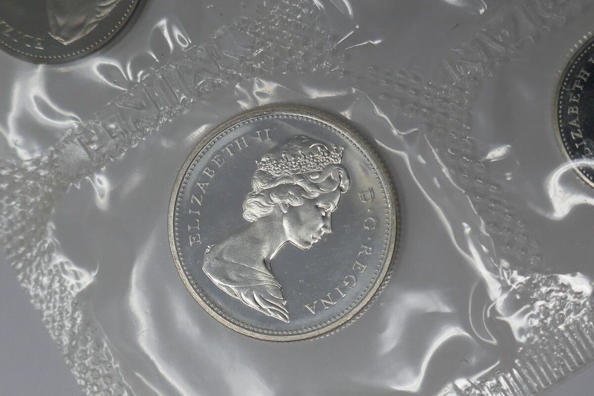 This six-coin Prooflike set includes the following Canadian coins: 1 cent, 5 cents, 10 cents, 25 cents, 50 cents and 1 dollar minted by the Royal Canadian Mint. The coins 10 cents - $1 coins are are made of 0.8 fineness silver. These come in their original cello packaging. Perfect for any coin enthusiast or collector looking to add a piece of Canadian history to their collection.