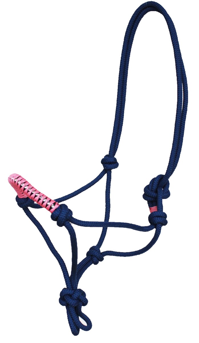 Challenger horse adjustable hand braided rope halter constructed from soft, yet strong and durable polyester. Halter is accented with a rhinestone inlay noseband.