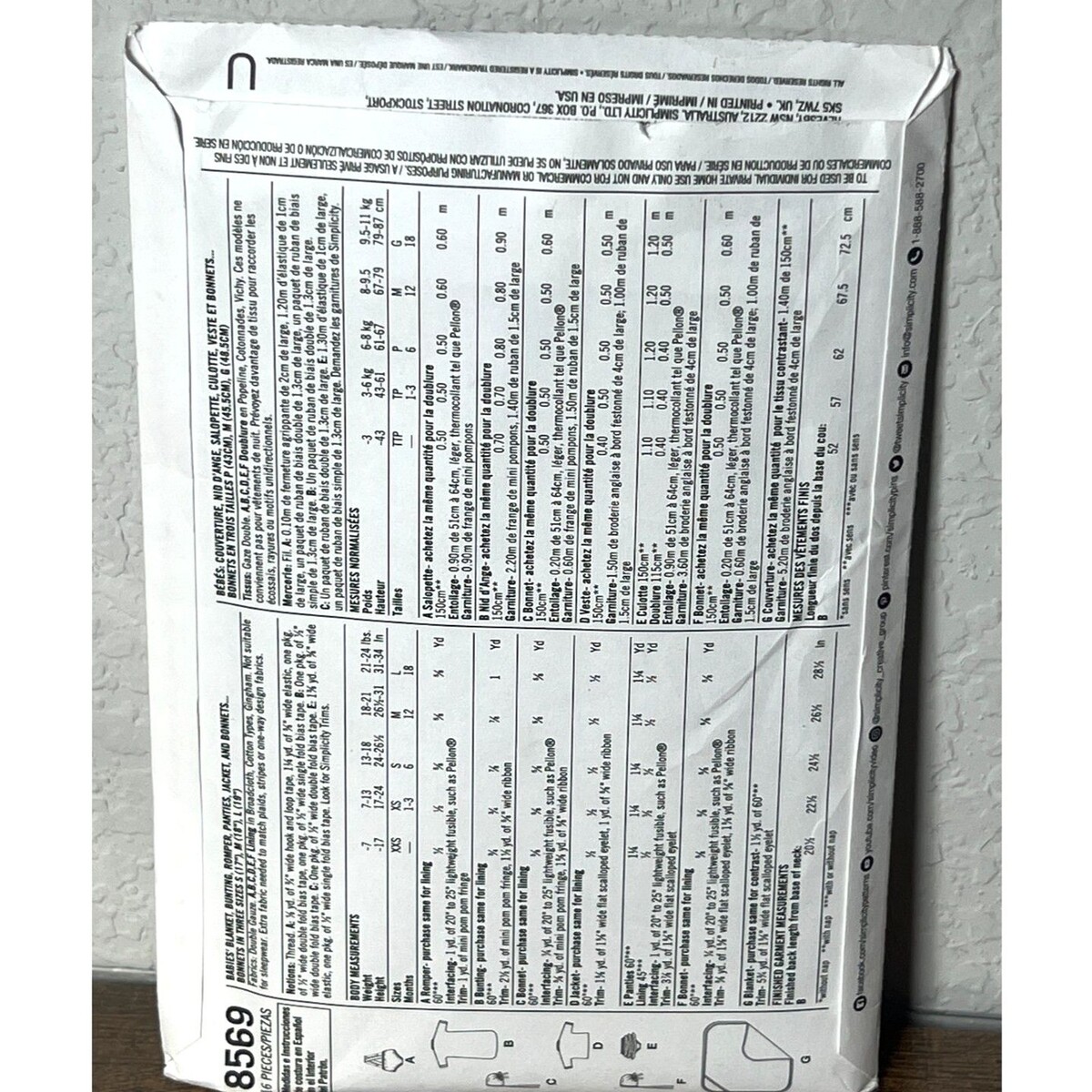 SIMPLICITY 8569 Sewing Pattern Baby Blanket Bunting Romper Panties Jacket Bonnet