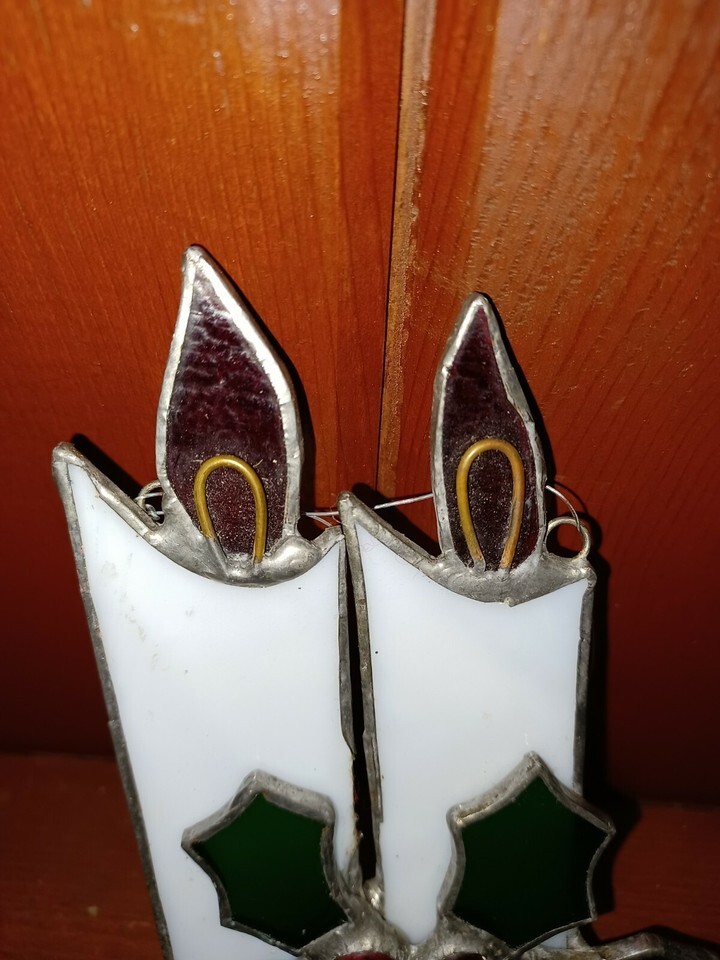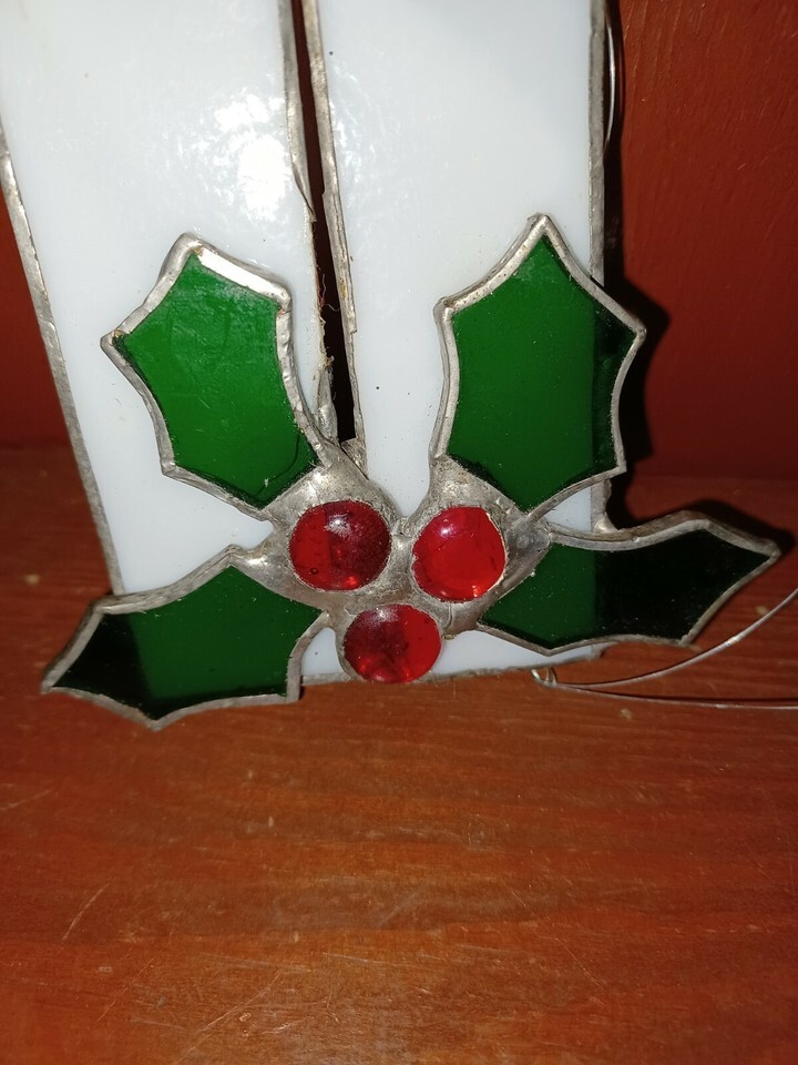 Vintage Stain Glass Suncatcher Christmas Ornament Holly Berry Candle